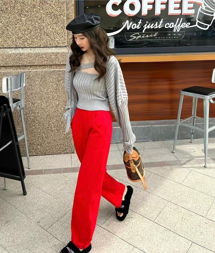 鮮豔的紅褲子,該怎麼搭配呢?休閒舒適的紅色運動褲,實在是太吸睛了,上衣選擇的灰色針織衫,版型有些修身,上緊下松的組合,很好優化身材比例,還顯瘦。