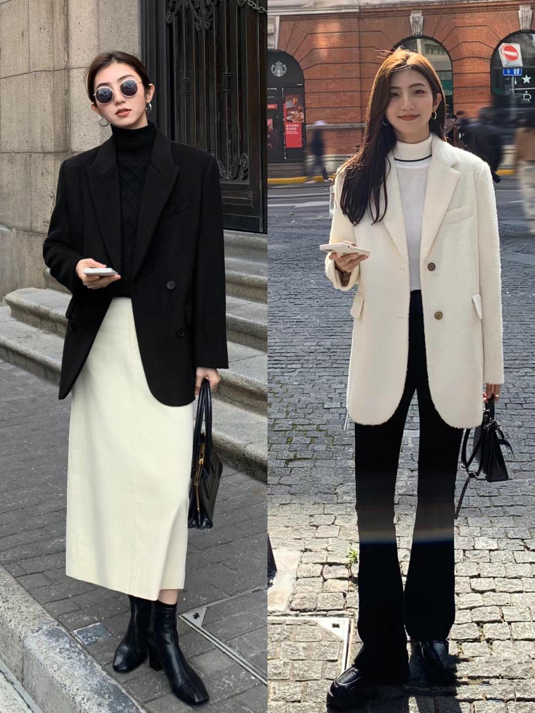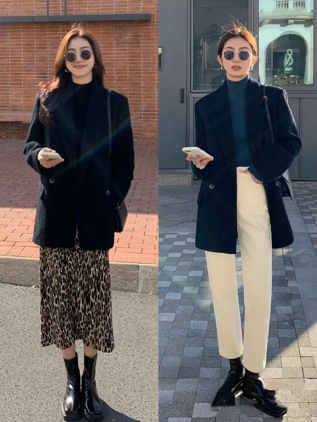 毛呢面料的西服外套,保暖性和舒適性都是非常強的。尤其是羊絨面料的西服外套,穿起來更加顯貴一點。不管是搭配半身裙、還是高腰褲,都很大方得體。
