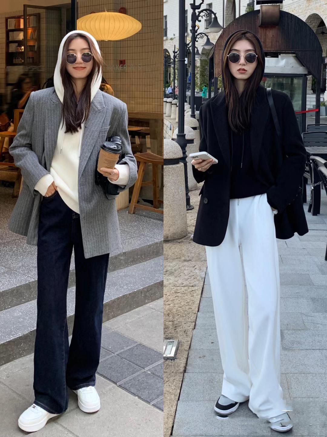 經典的毛呢西服外套,我們可以搭配比較修身的內搭,形成一種鬆弛有度的對比。寬鬆的毛呢西服外套,配上修身的打底衫,保暖又高級。