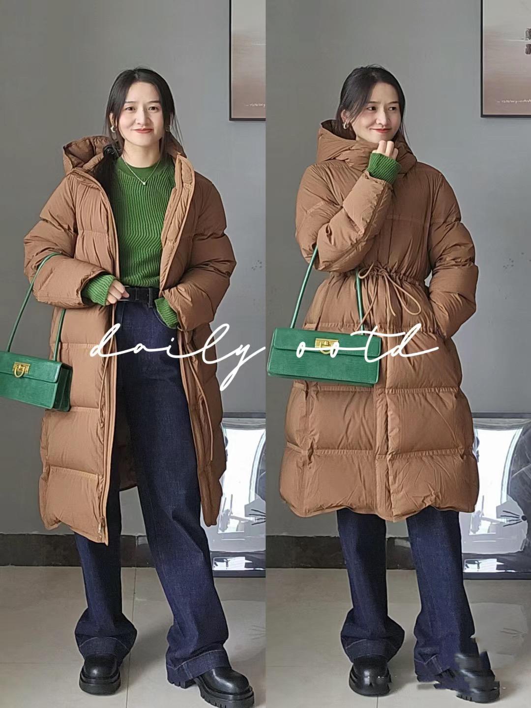 棕色系的中長款羽絨服,可以直接配直筒的牛仔褲來穿着。直筒牛仔褲、可以選擇一種相對寬鬆的版型,穿起來更顯得雙腿修長挺拔,搭配厚底鞋、也時髦又洋氣。
