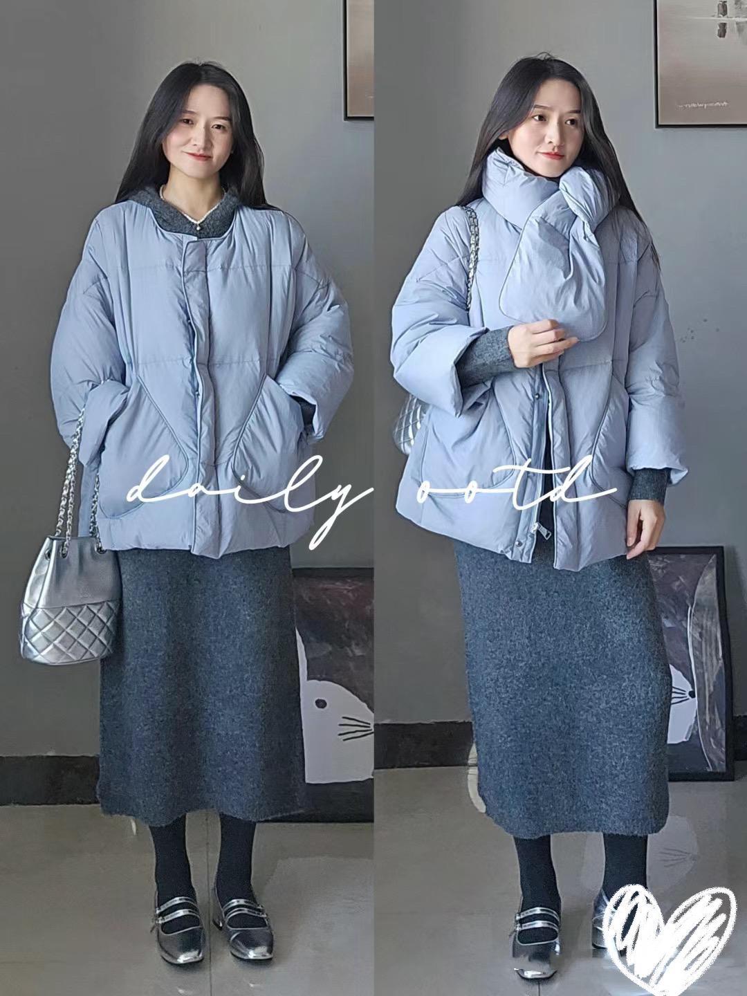 淺藍色羽絨服,蓬鬆的款式、穿起來保暖性更強。我們可以搭配直筒的針織半身裙,散發出時尚的女性魅力。針織半身裙、自帶溫柔感,修身的剪裁也散發時尚魅力。
