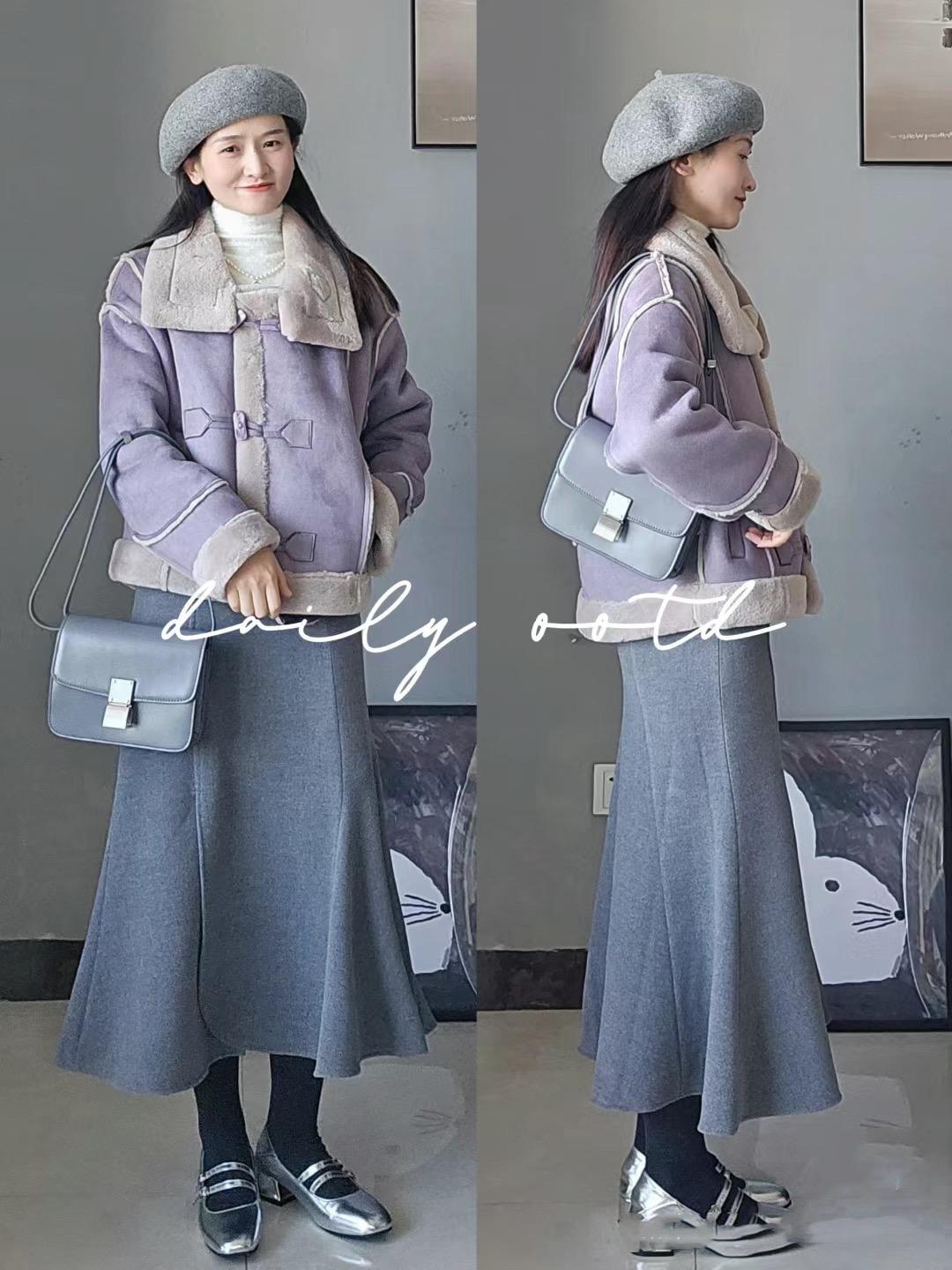 淺紫色的皮毛一體外套,搭配了修身的白色半高領打底衫,有一種更加溫柔甜美的氣質。尤其是搭配了灰色系的毛呢半身裙,將女性的溫柔美自然呈現,這種灰色毛呢半身裙也很耐看。