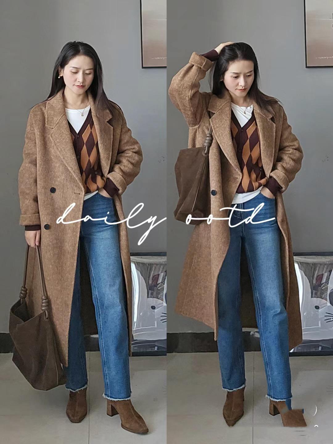 高腰的直筒牛仔褲,就像是萬能又百搭的單品,與棕色大衣搭配在一起,透着青春的美感,顯腿長又減齡。日常的搭配中,其他色彩的長大衣,也可以搭配直筒的牛仔褲穿着,都很利落大氣。
