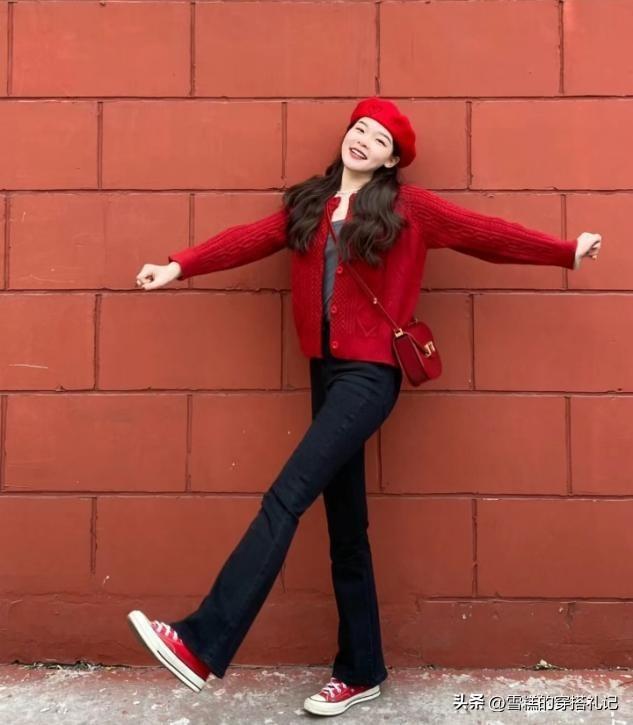 對於身材比例的疊加延伸效果,我們少不了超短款上衣的加持,一件短款的羽絨服或者毛衣,下襬的長度基本上是不遮過腿部的,但是這個腰線的設計比較適合我們去匹配高腰馬蹄褲,一來二去就拉扯了比例走向。