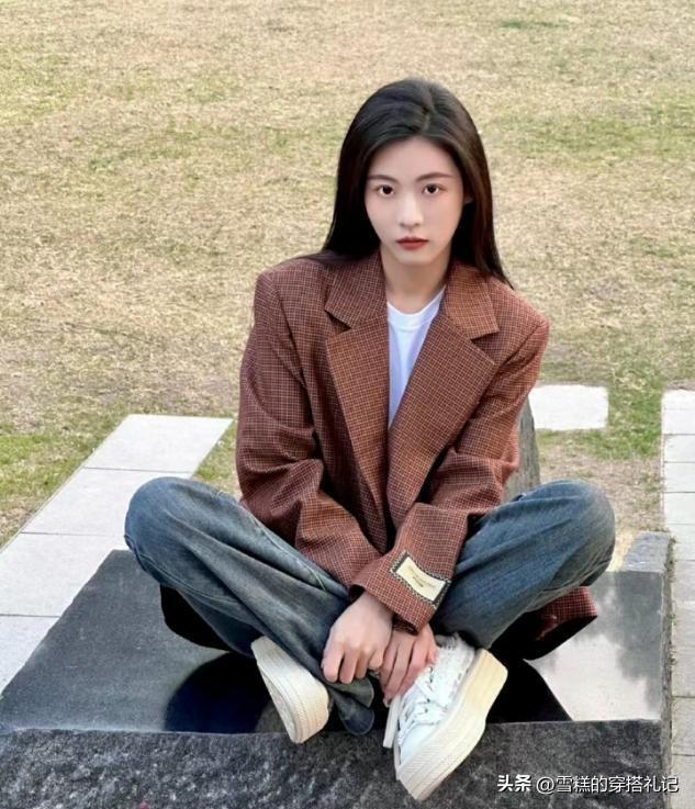 造型配色選擇淺,同色系的組合入門門檻比較低,爲了更好的完善縱向的直線條,我們可以用藍色系搭配一整套,穿搭牛仔面料的馬蹄褲也很得體。