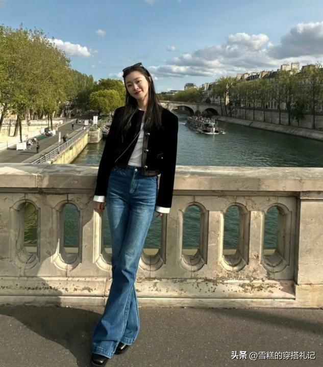 ①高腰線條配喇叭褲走向,身材延長比例很好看