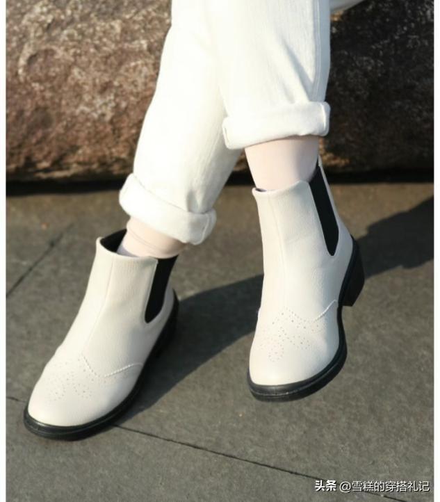 鞋子表面的顏色匹配可以不用一面光,比如拉鍊或者是鬆緊部位,利用深色系做好色塊的對比,圖中這樣一雙黑白匹配色系的奶奶短靴,從40歲穿到60歲都完全不膩,搭配裙裝褲裝是不同的風格展示。