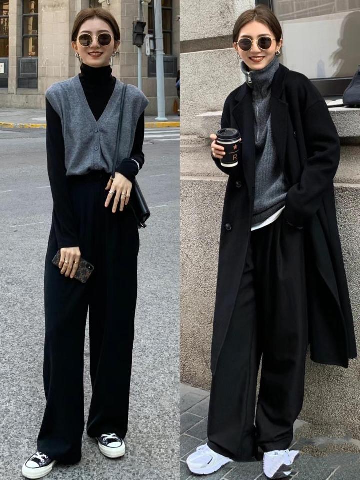 黑灰色的穿搭,原來也可以這麼高級大方。黑色高領打底衫,配上V領的針織衫,能夠修飾臉部和頸部線條,擁有一種小V臉的效果。