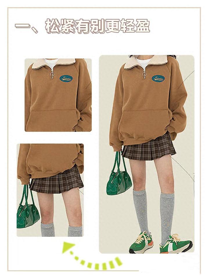 寬鬆的衛衣,穿起來舒適大方,羊羔絨的內裏也會更加保暖。一雙小腿襪可以修飾我們的小腿線條,顯得身體形態更加輕盈一些,這種鬆緊有別的搭配就不會顯得臃腫。