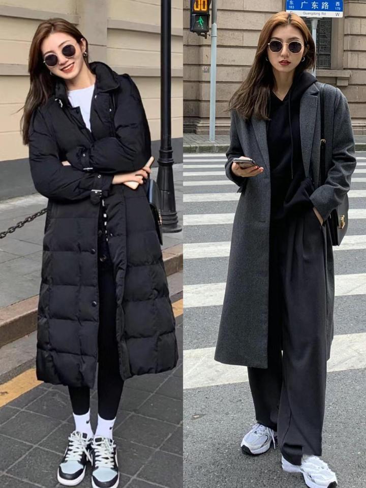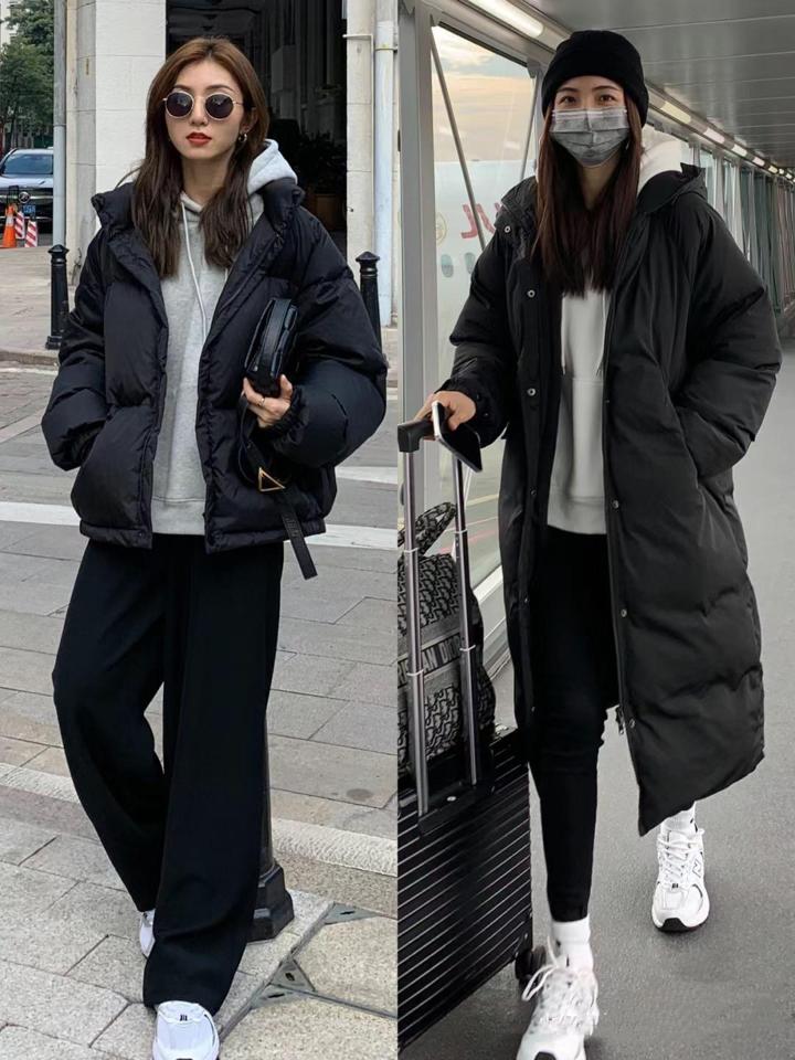 在疊搭中,想要更加高級耐看一些,我們可以選擇經典的黑白配。寬鬆的黑色羽絨服,搭配修身的鯊魚褲,就是一種典型的鬆緊對比。