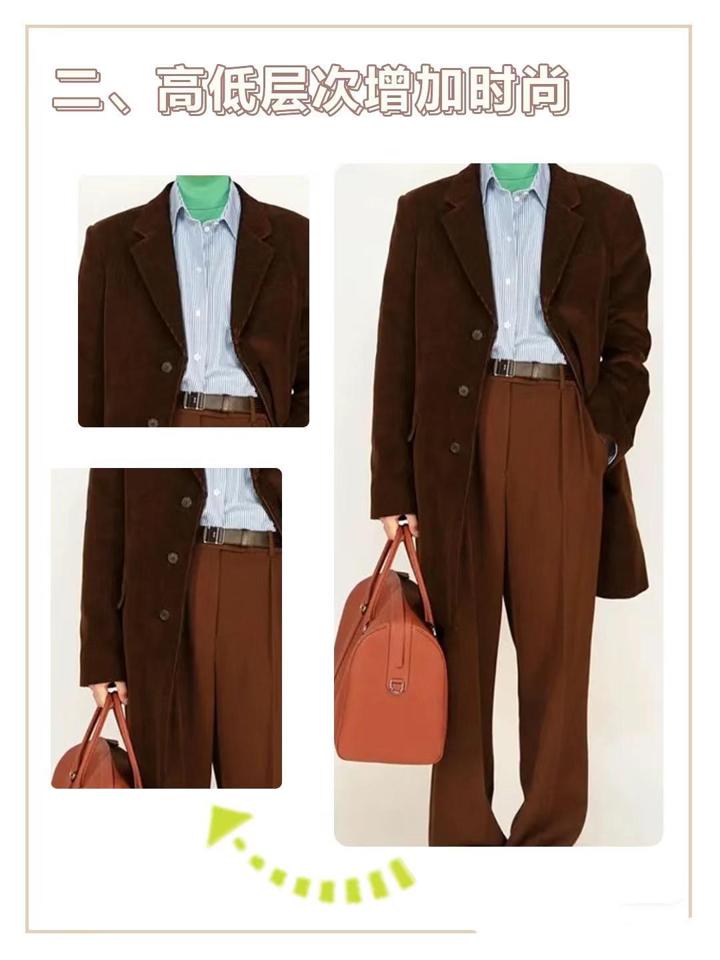 利用不同單品之間的色彩、質感呼應,都可以增強整體的協調性。比如棕色包包與棕色長靴的搭配,就有一種優雅大氣的美,讓低調的疊搭更加耐看。