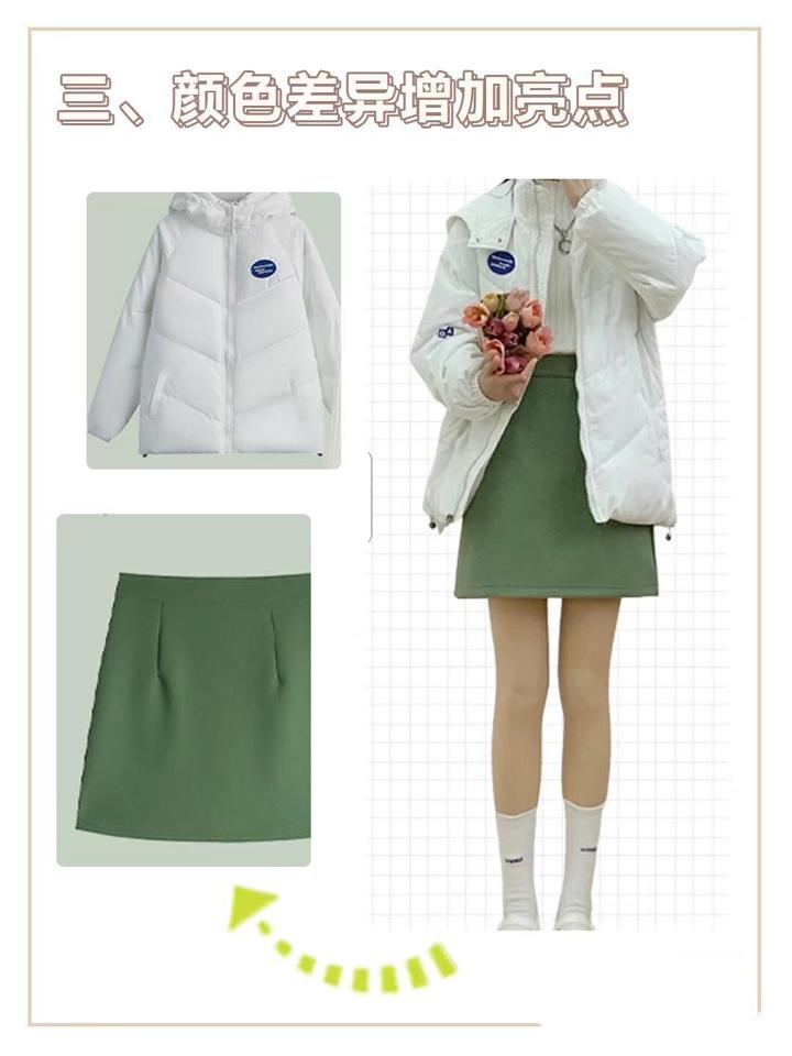 比如我們可以用白色羽絨服來搭配綠色系的半身裙,兩種對比度比較明顯的色彩搭配在一起,不僅層次清晰、也更加活潑舒適,給人一種時尚大氣美。