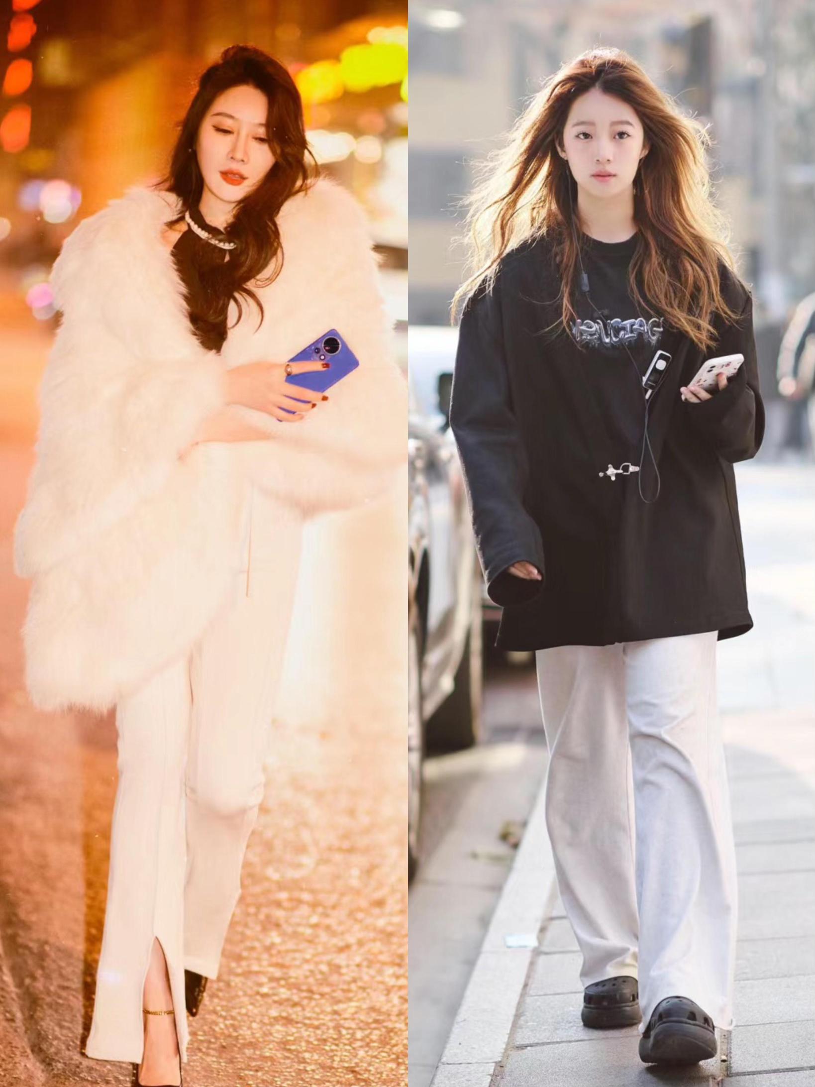 一頭披肩的微卷發、溫柔又嫺靜。白色皮毛外套,搭配了修身的大領口打底衫,可以形成一種外鬆內緊的效果,配開衩的白色長褲,搭一雙高跟鞋時髦又顯氣質。