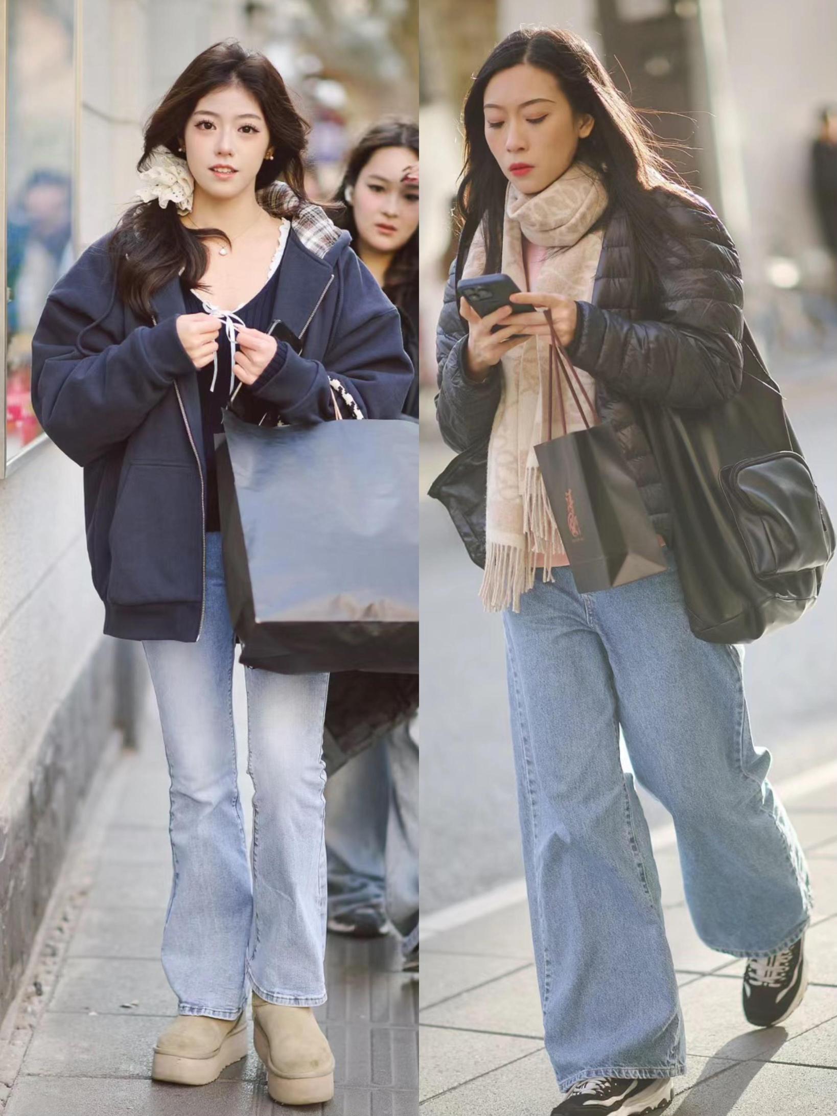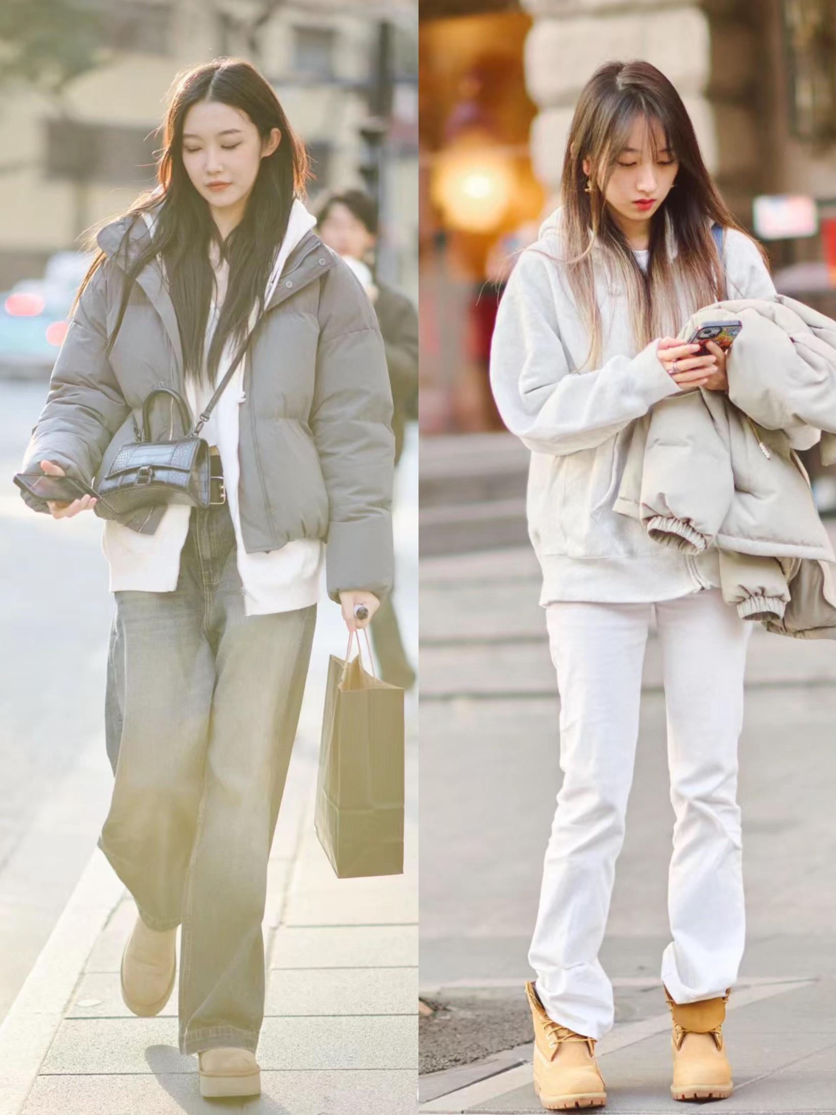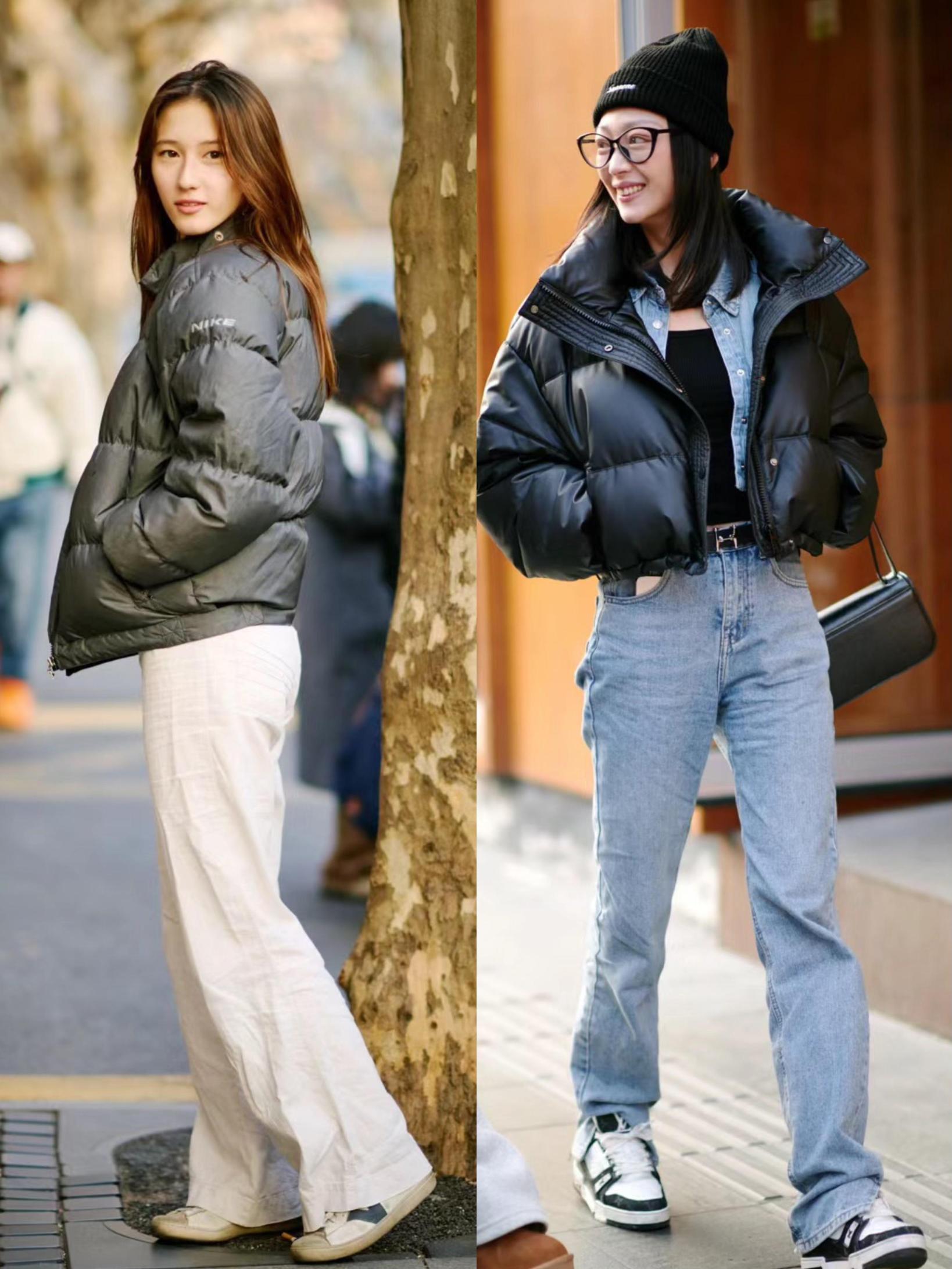 一件淺灰色的羽絨服,可以選擇稍微寬鬆的版型、穿起來舒適度也會更強。尤其是短款的淺灰色外套,我們可以搭配高腰的直筒牛仔褲來穿着。
