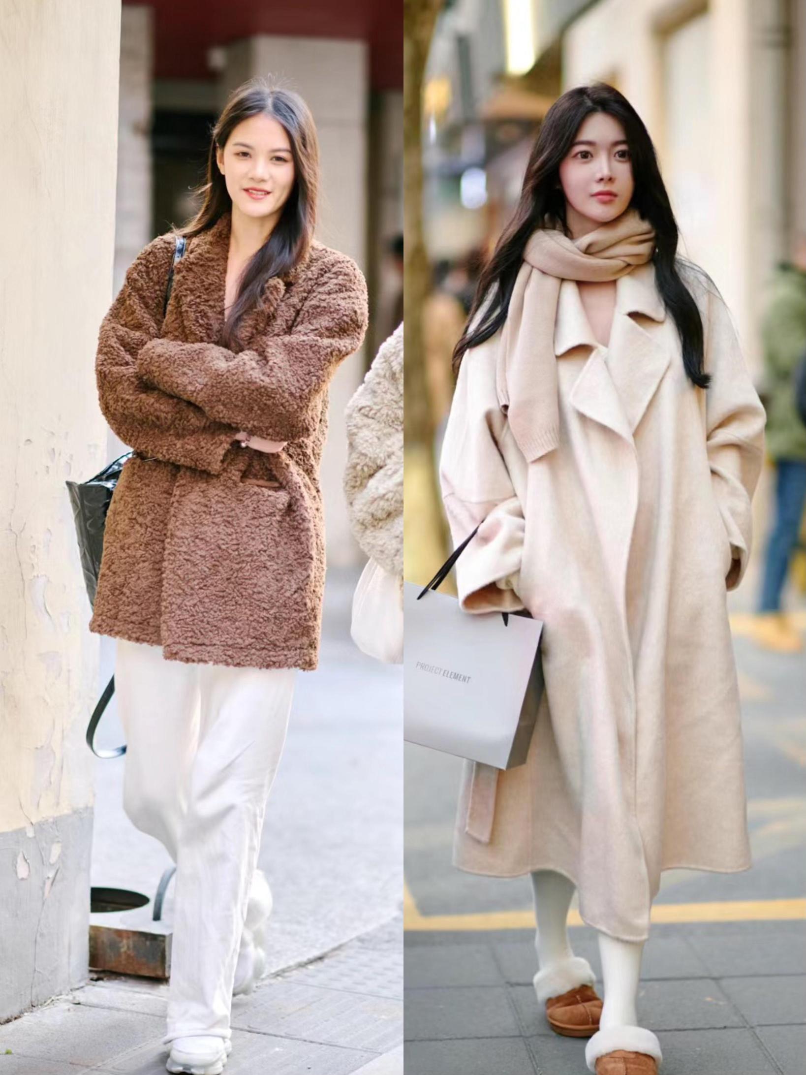 米白色大衣,寬鬆的版型舒適慵懶,擁有一種更時尚的氛圍。像這種米白色長大衣,我們可以配修身的打底褲穿着,修身打底褲表現出小腿的纖細,有一種輕盈之美。