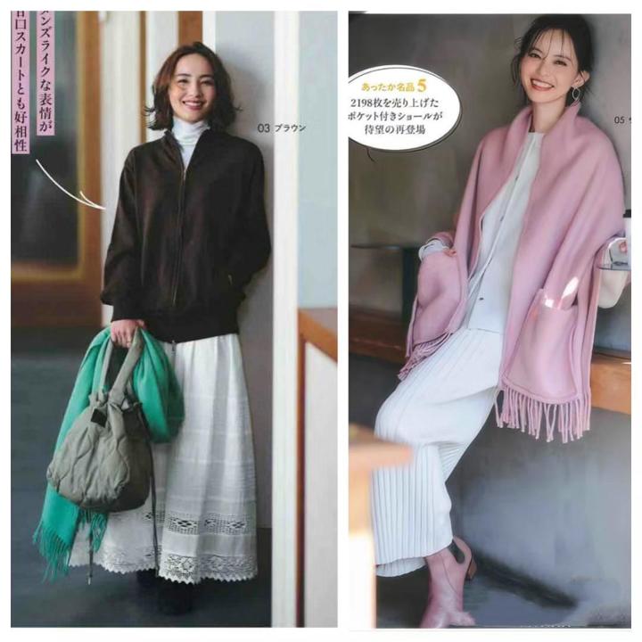 稍微寬大一點的圍巾,既可以系在頸部、又可以披在肩膀上形成披肩圍巾。這種披肩圍巾,更加適合溫柔大氣的女性。