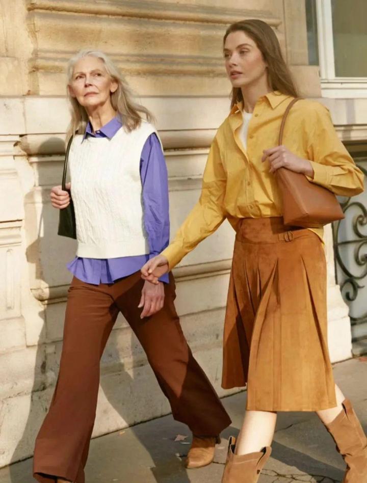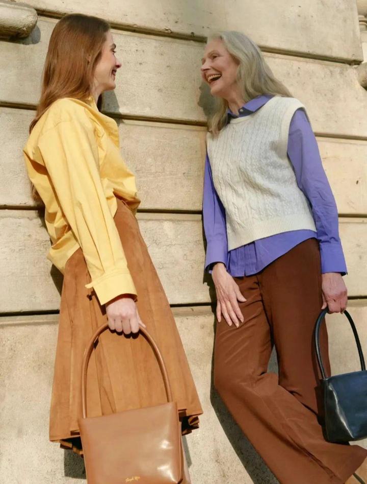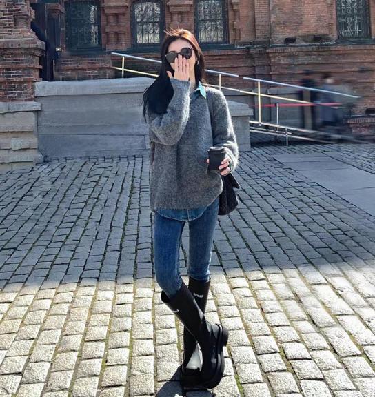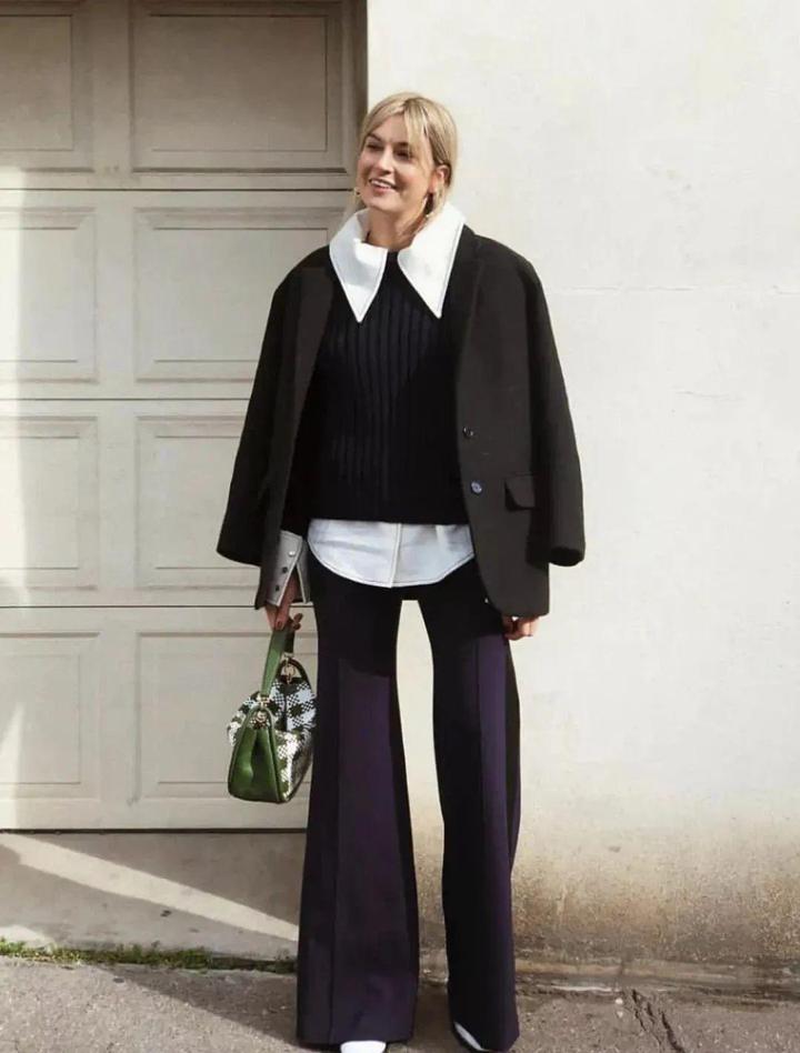 將襯衫疊穿在毛衣裏面,然後再露出襯衫的衣領、下襬和袖子,製造出層次感,又減齡時髦。不過要注意的是毛衣的版型記得選寬鬆一些,這樣才能穿得好看。