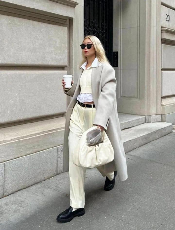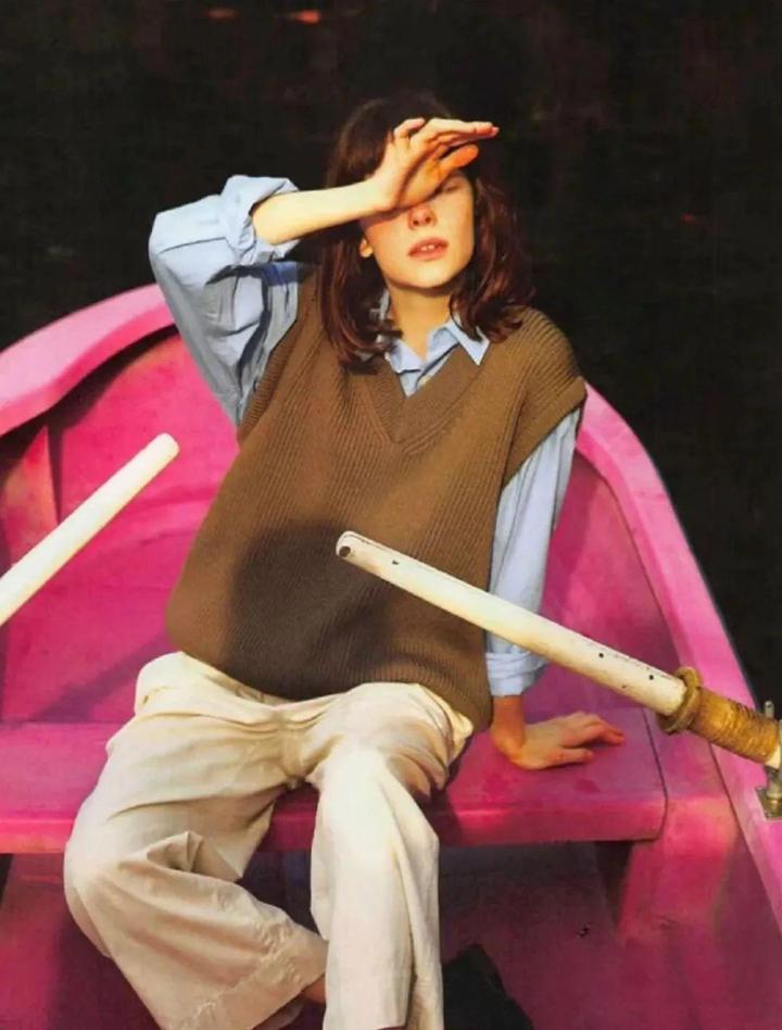 毛衣馬甲的顏色可以選淺色或低飽和度的亮色,作爲整個造型的提亮單品妥妥的,搭配深色大衣也不用怕。