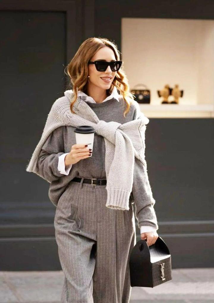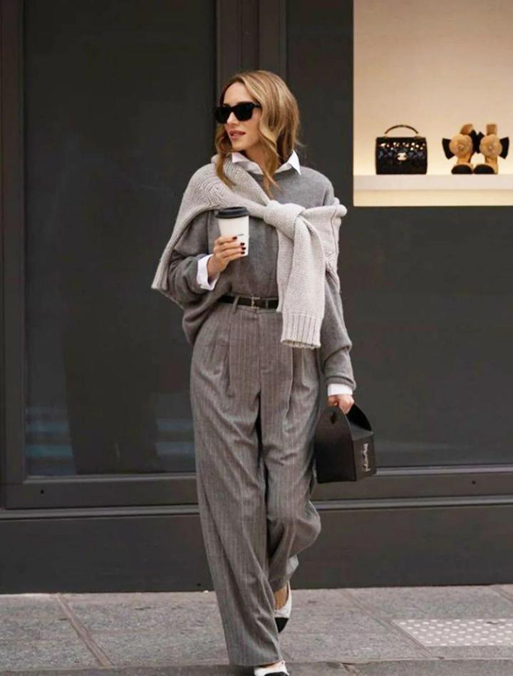 下身的搭配,也不需要太過於費心思,下裝與襯衫同色可以將身材比例拉得很修長。當然,下裝與毛衣同色,兩者則起到了色彩呼應的效果。