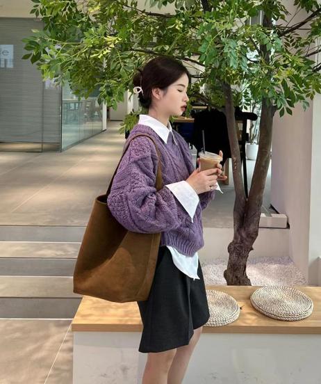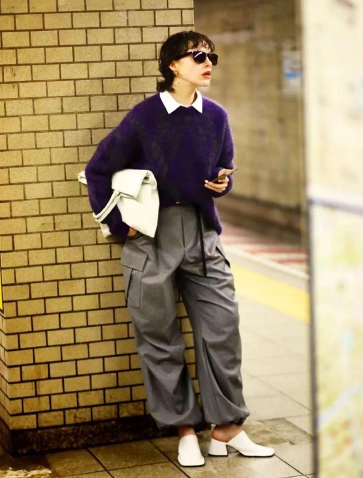 毛衣的版型選擇寬鬆一些,穿起來後就很舒適自在,也能帶給人慵懶的味道,露出袖口、下襬和領子,打造層次感的同時,又彰顯出穿搭的細節感。