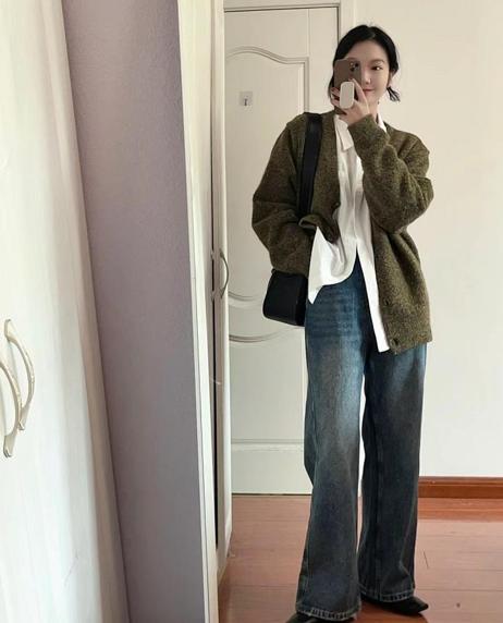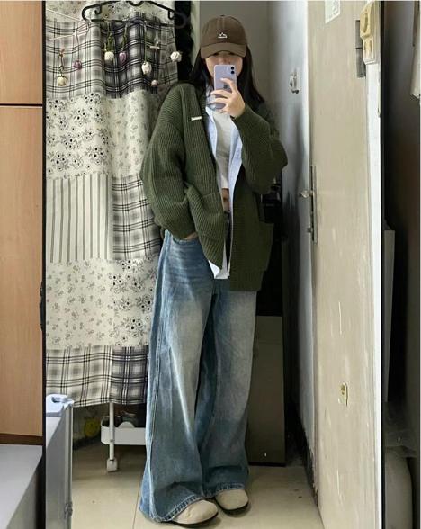 毛衣開衫+藍色襯衫+牛仔拖地褲,鬆弛隨意又自在,毛衣的綠色非常有質感,還自帶復古feel,在春天的時候,這麼穿就對了。