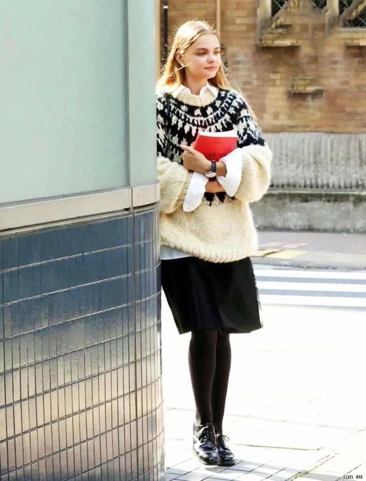 在北方的女生,可以將毛衣換成高領的款式,這樣保暖效果會更佳一些,高領毛衣+襯衫,襯衫穿在毛衣外,衣領處的紐扣稍微解開幾顆,露出裏面的毛衣,這樣就更多了幾分隨性。