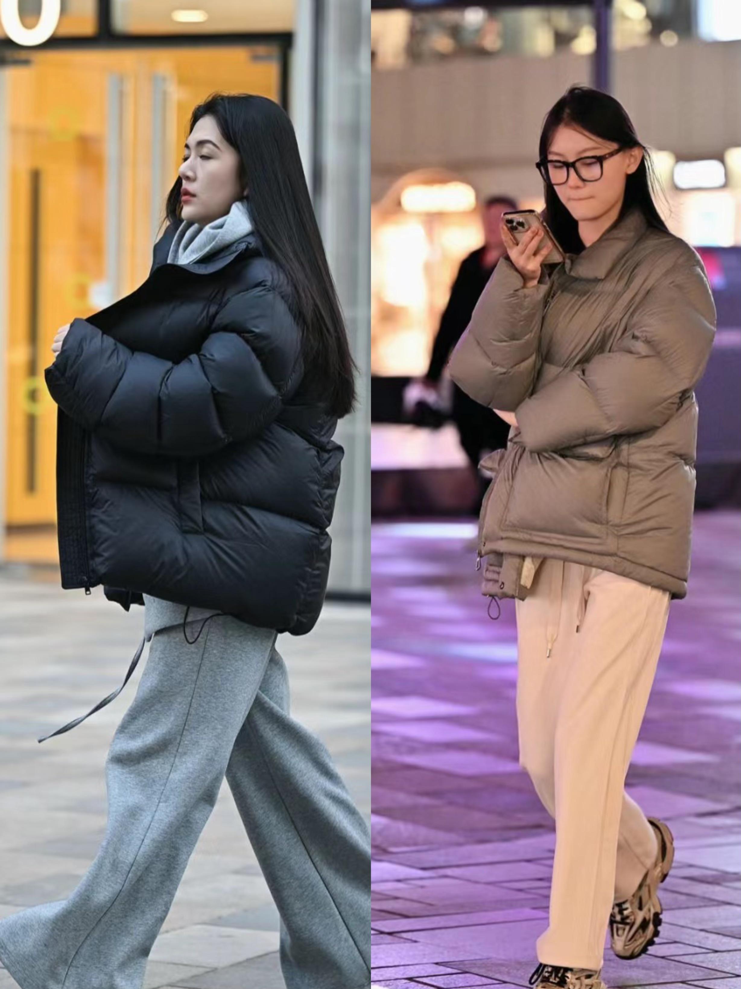 這樣基礎日常的短款羽絨服,可以搭配毛呢褲、也可以搭配闊腿褲或者運動褲來穿着。寬鬆的闊腿褲,會具備一定的舒適性,搭配加絨加厚的面料、保暖性也更強。