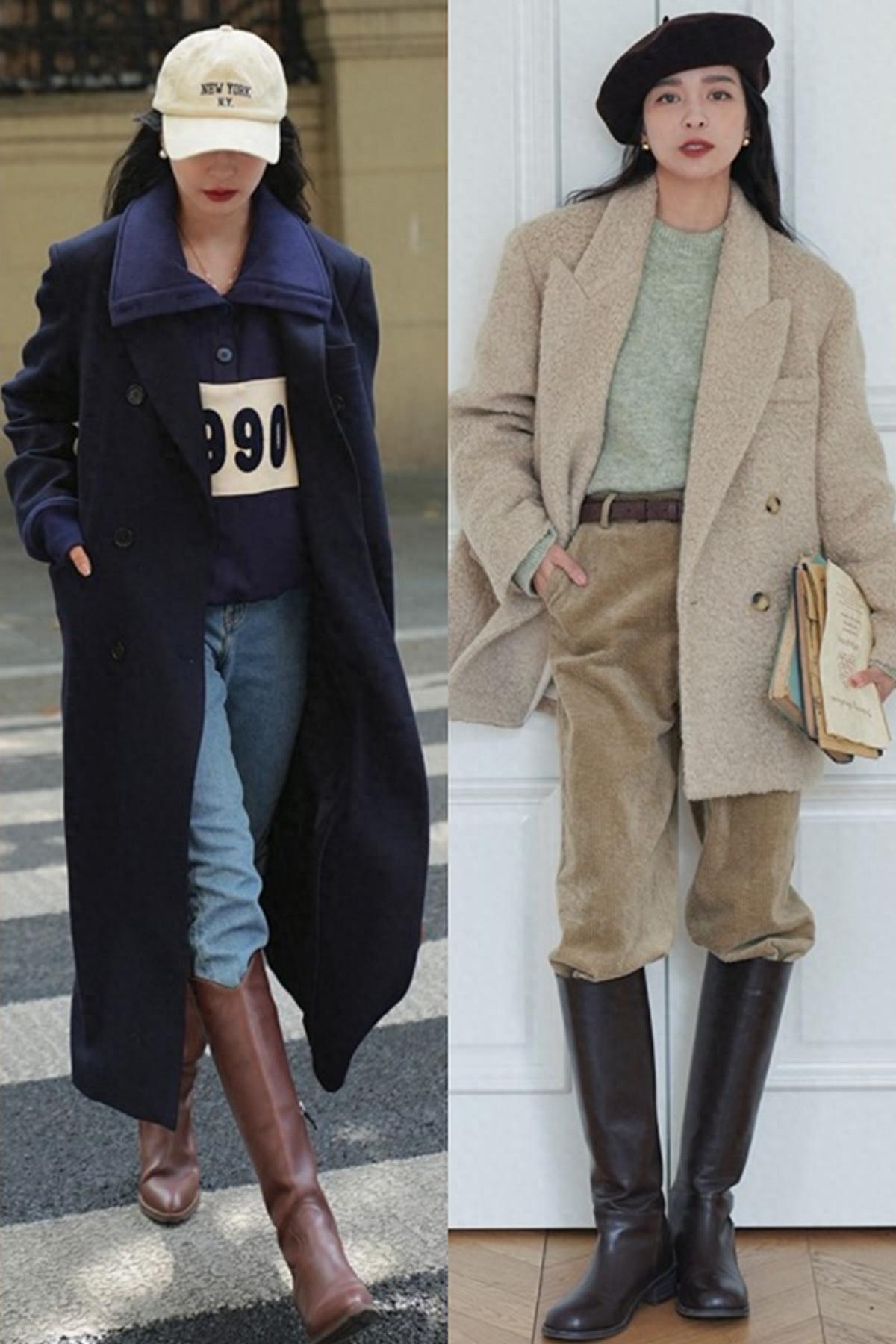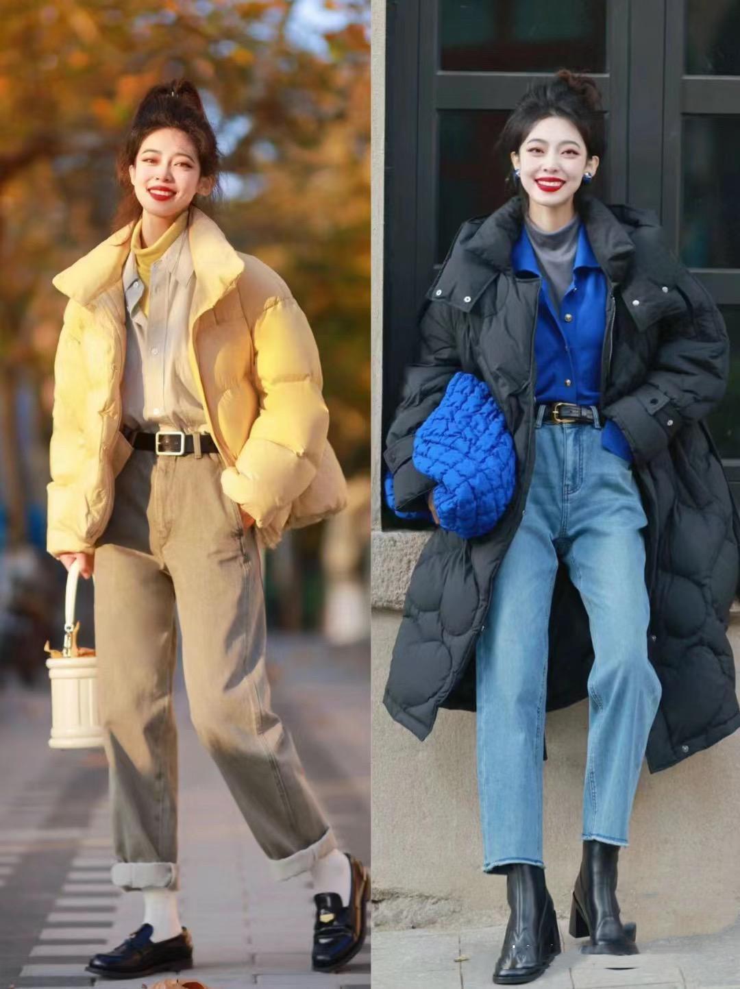 雙面呢的大衣,儘量搭配羊絨的質地,穿起來軟糯挺闊又更加保暖。修身的打底衫,針織衫,都可以選擇比較細膩一點的款式。牛仔褲或者毛呢褲,面料需要更加挺闊。