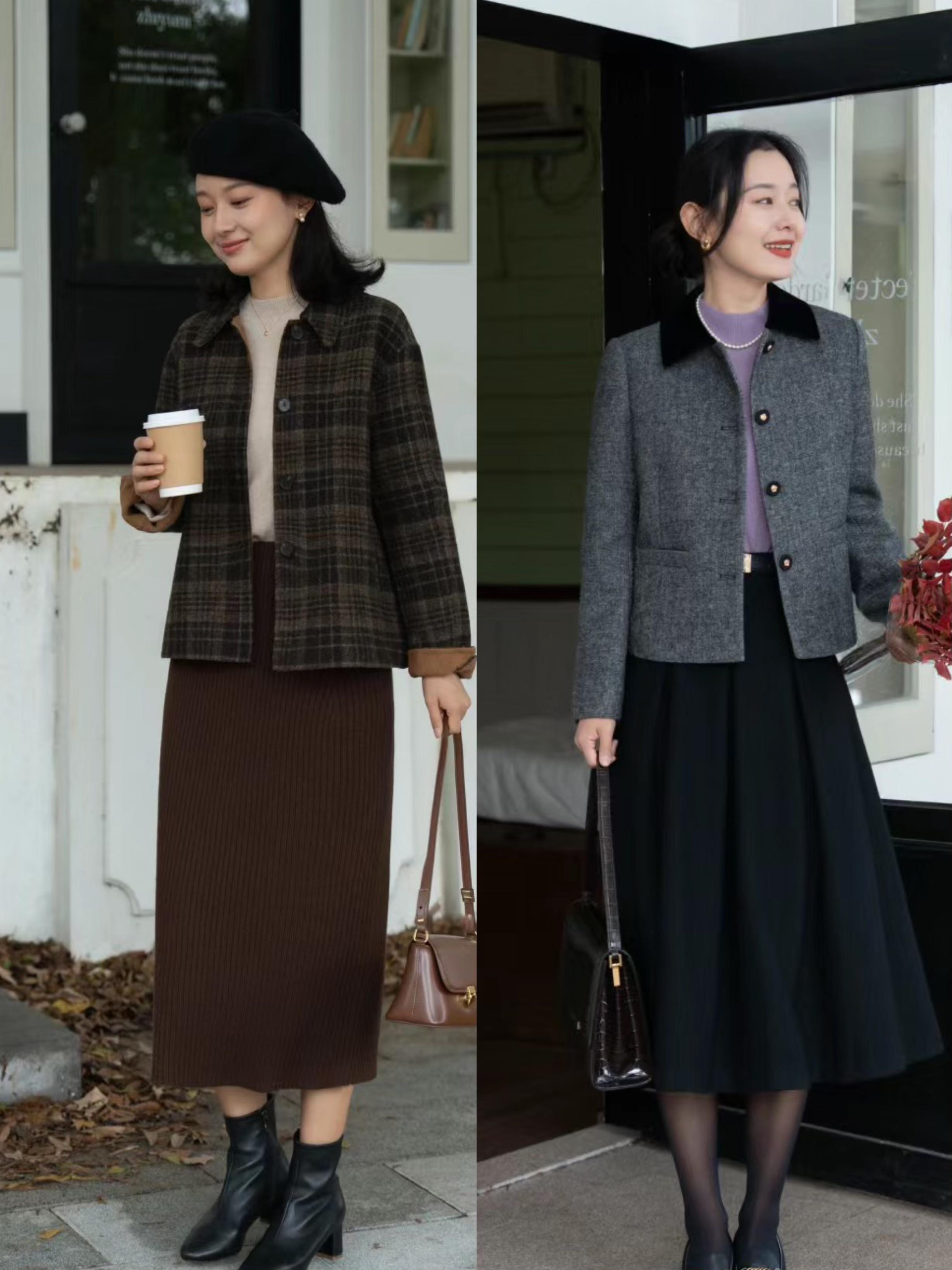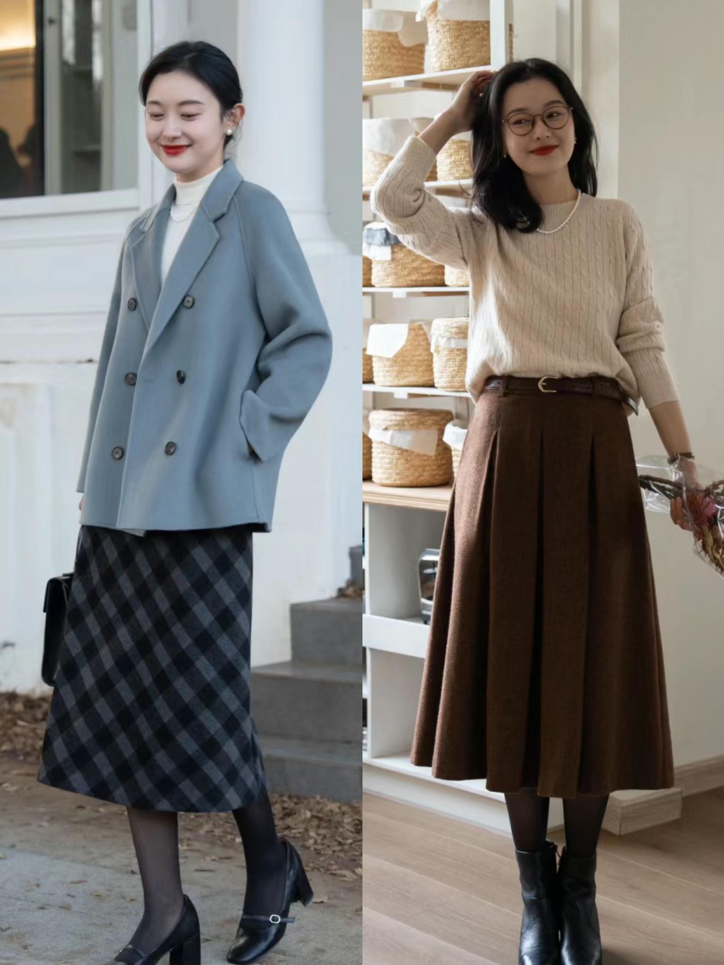 過膝半身裙是溫柔的、也是浪漫的,擁有更強的包容性。我們選擇過膝半身裙,儘量搭配比較厚實一點的面料,毛呢、燈芯絨、條絨、絲絨都是比較適合冬天的。