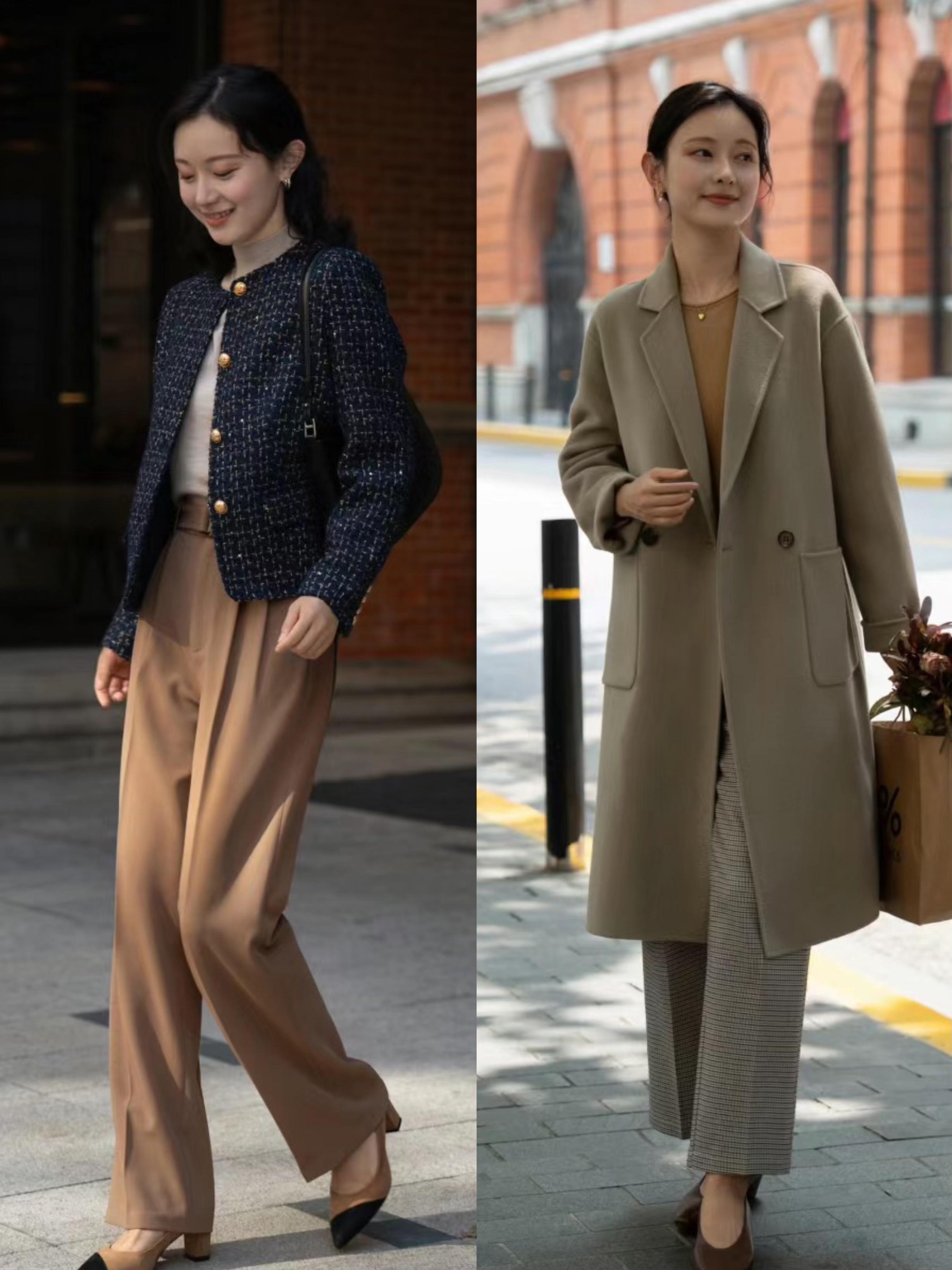 燕麥色的毛呢大衣,可以搭配色調溫和的毛呢褲。毛呢褲面料更加厚實,穿起來保暖又防風。利落的九分毛呢褲,剛好露出腳踝位置,視覺上也更顯瘦。