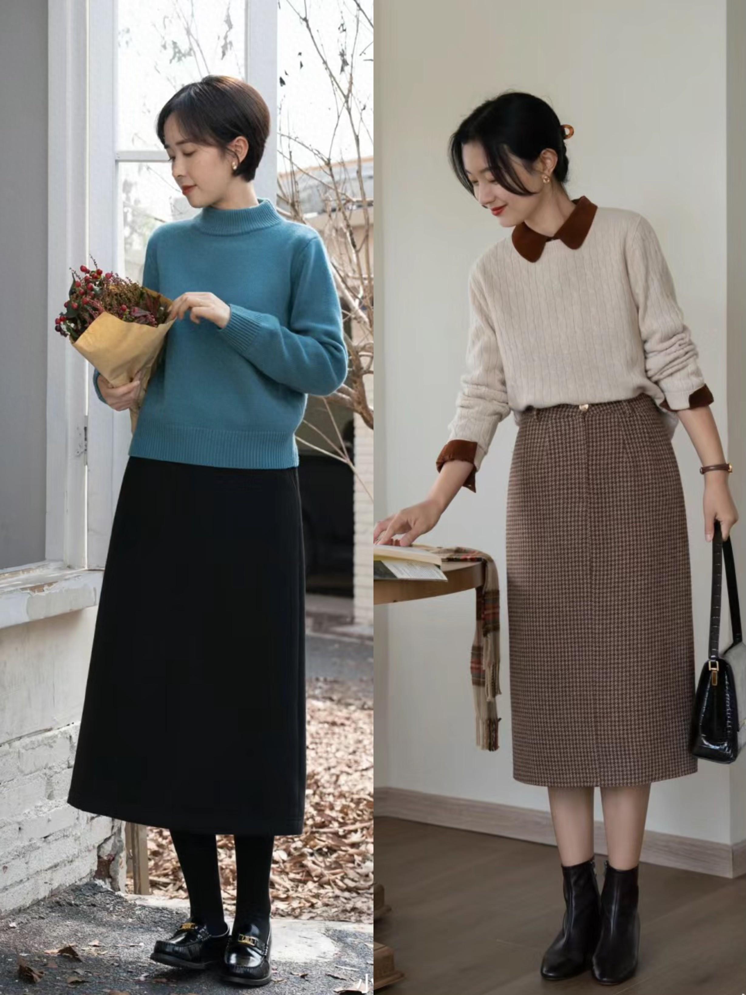 成熟女性的優雅,與服裝的搭配也有着密不可分的關係。不管是純色淨版的毛衣、還是修身的針織衫,都可以搭配過膝的半身裙來穿着。