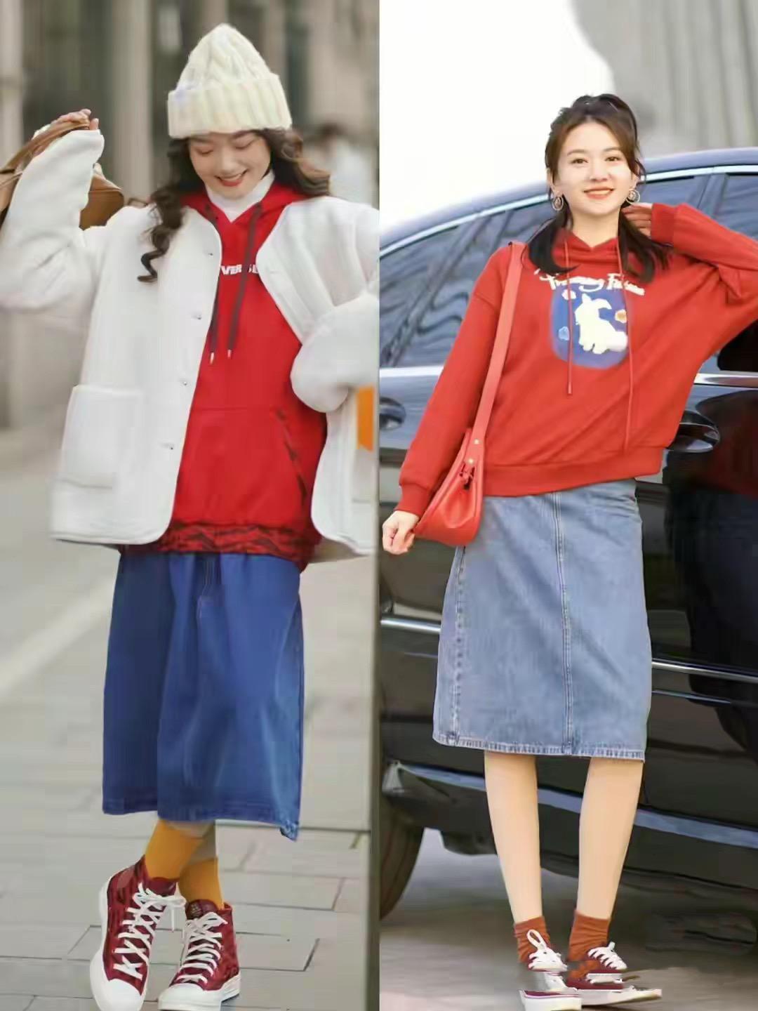 紅色連帽衛衣,可以配直筒的牛仔半身裙來穿着。直筒的牛仔半身裙、簡簡單單的就很大方。尤其是腰臀部有點粗壯的女性,都可以選擇高腰的A字形牛仔半身裙,時髦減齡。