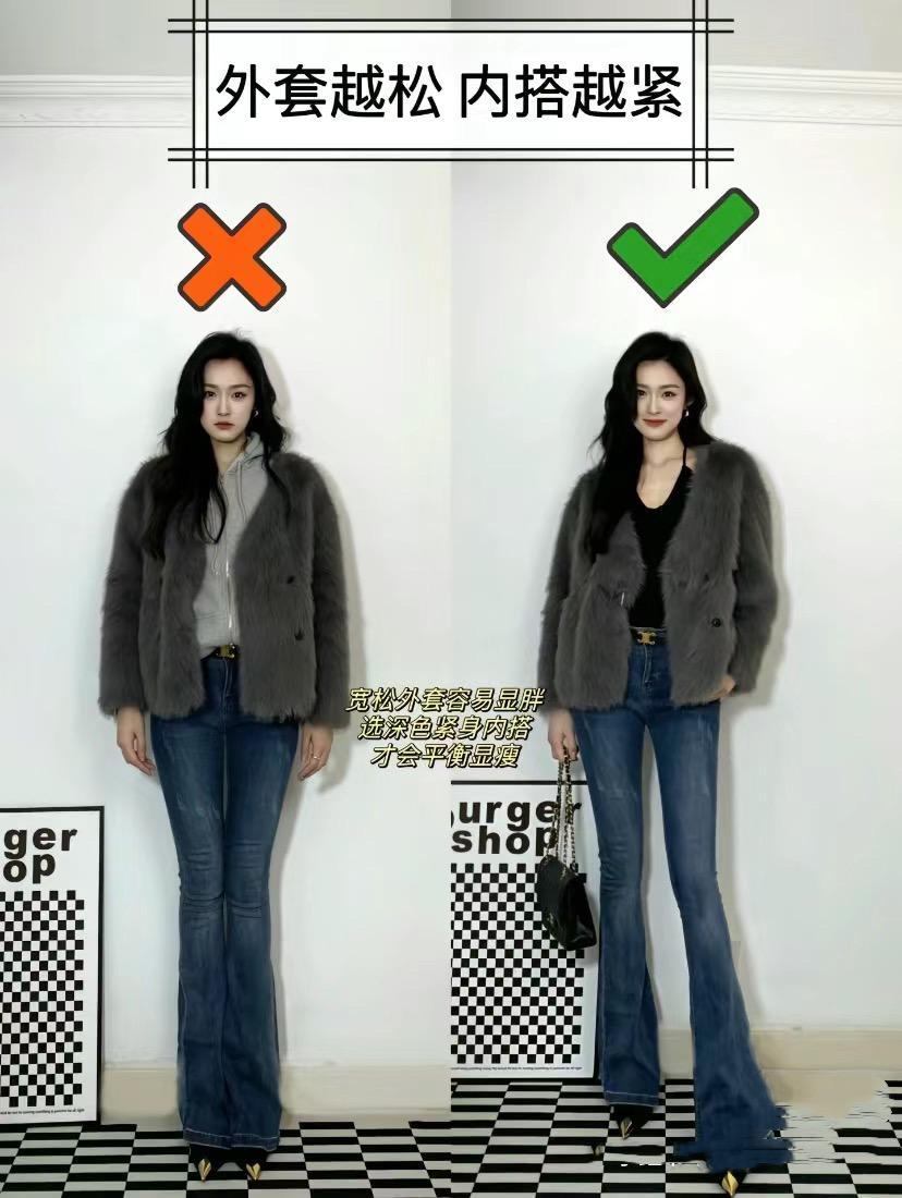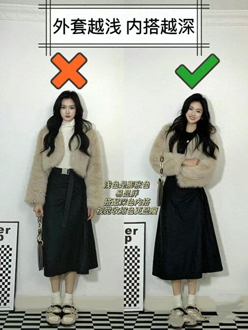 深色內搭可以具有一定的視覺收斂性,起到不錯的顯瘦效果。比如稍微帶有膨脹感的皮草外套,搭配了收腰的黑色連衣裙,不僅更加顯瘦、還格外的優雅有氣質。