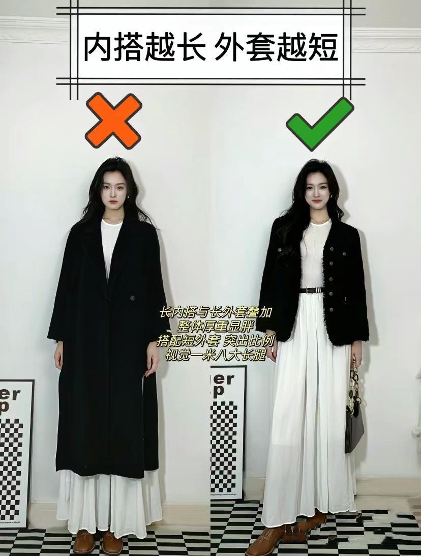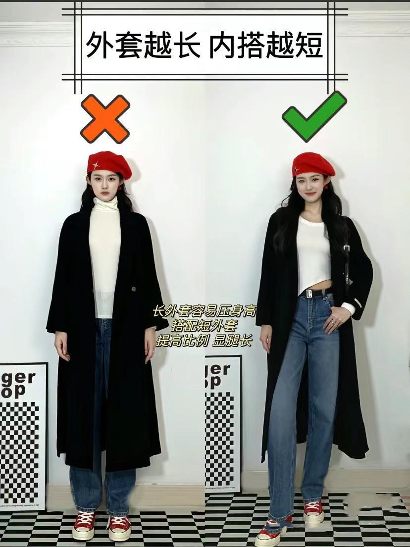 利用長短的對比,來劃分身體的比例感,也是一種很直觀又顯高的穿衣方式。長款的內搭,可以搭配短款的外套,整體比例感更優越。
