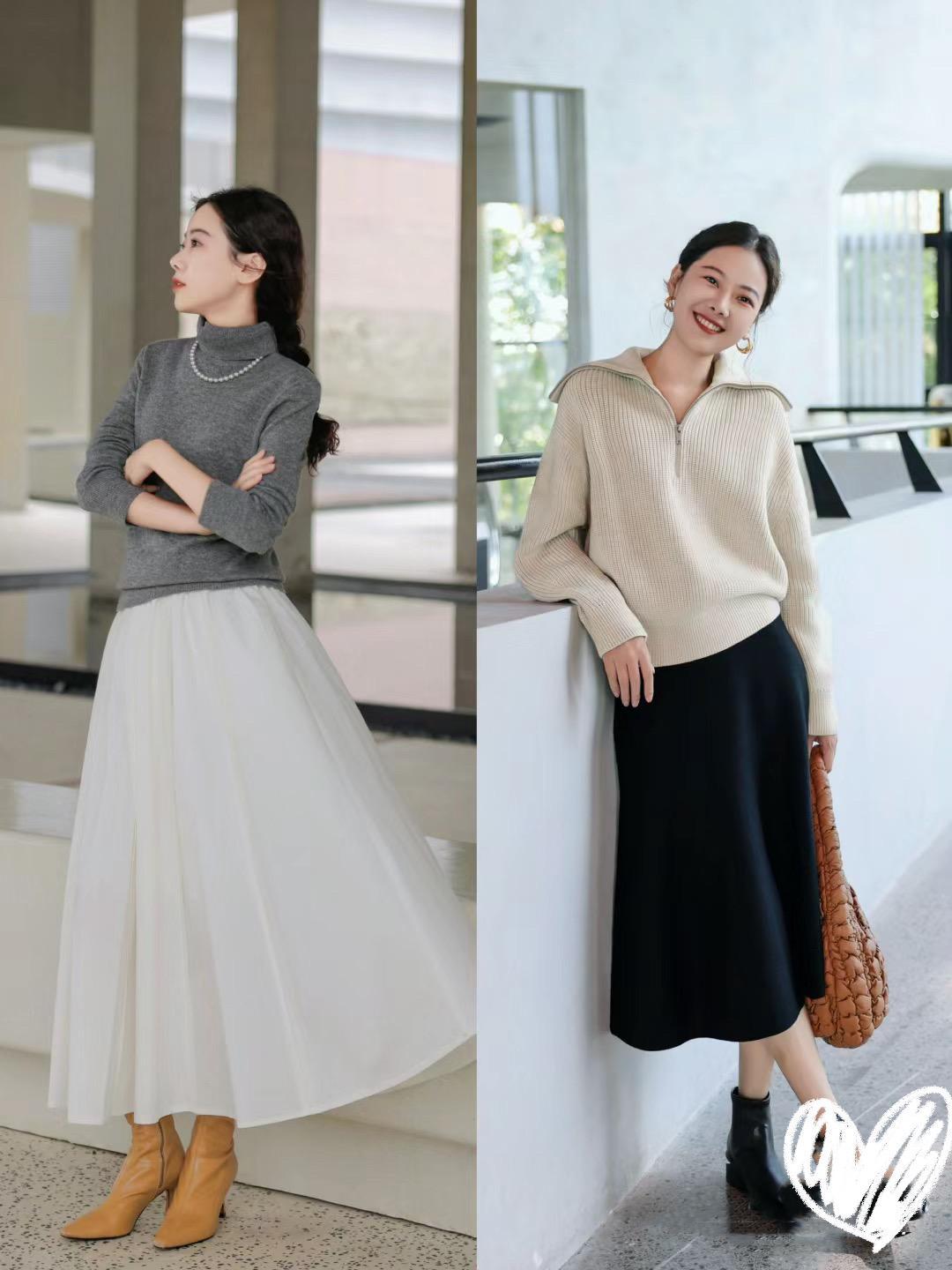 1、羊絨毛衣+半身裙