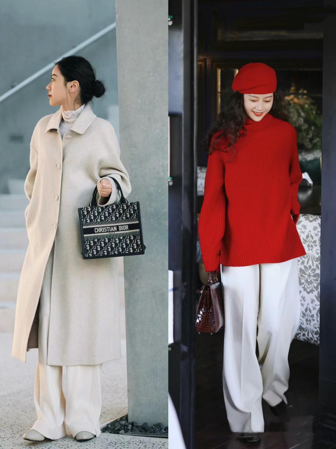 寬鬆的紅色毛衣,可以搭配純淨的白色闊腿褲。白色闊腿褲乾淨清爽、我們配紅色毛衣穿起來也溫柔大方。尤其是這種白色系的闊腿褲,給人一種很高級大氣的美感。