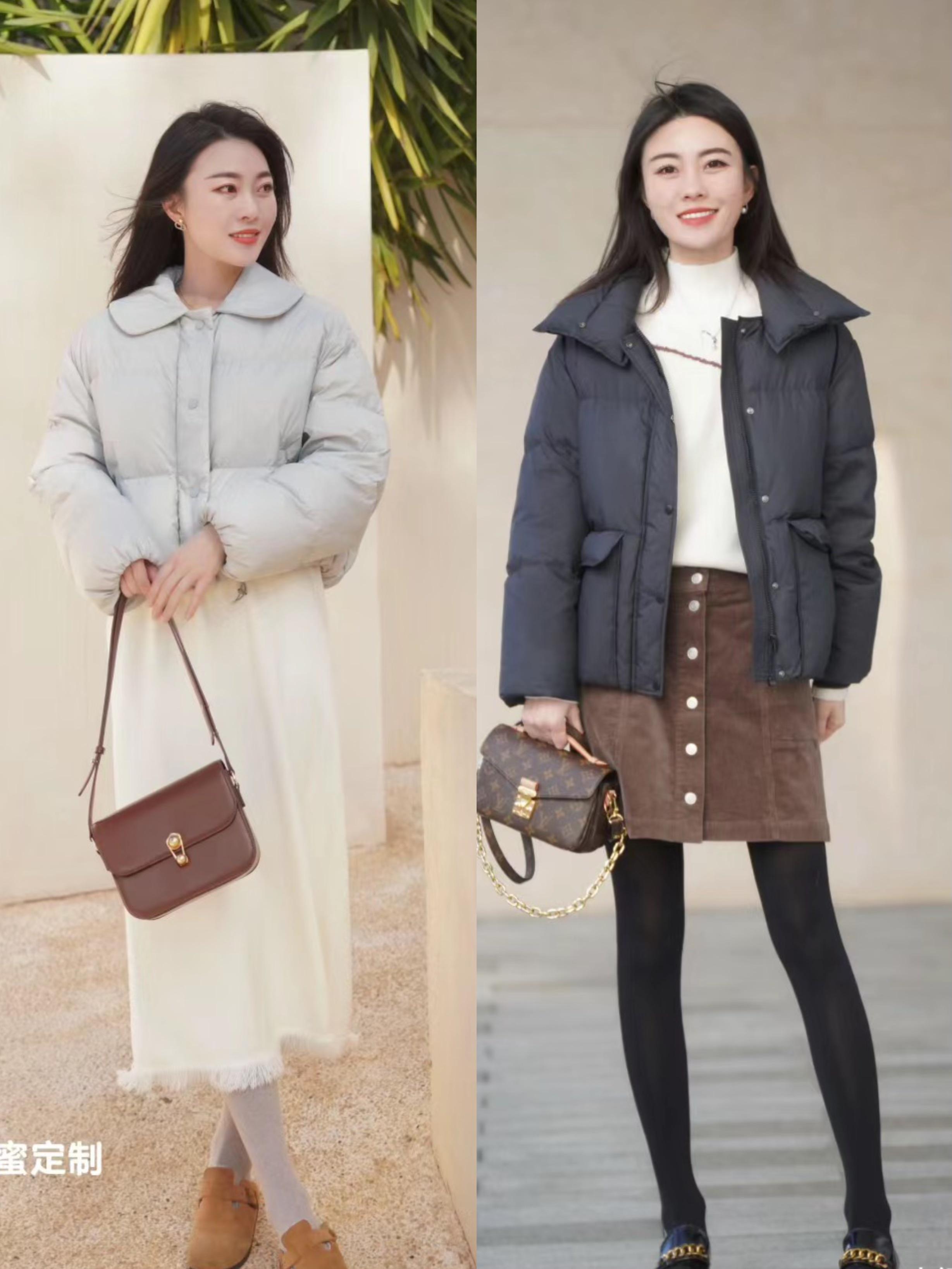 1、國風羽絨服+A字形半身裙