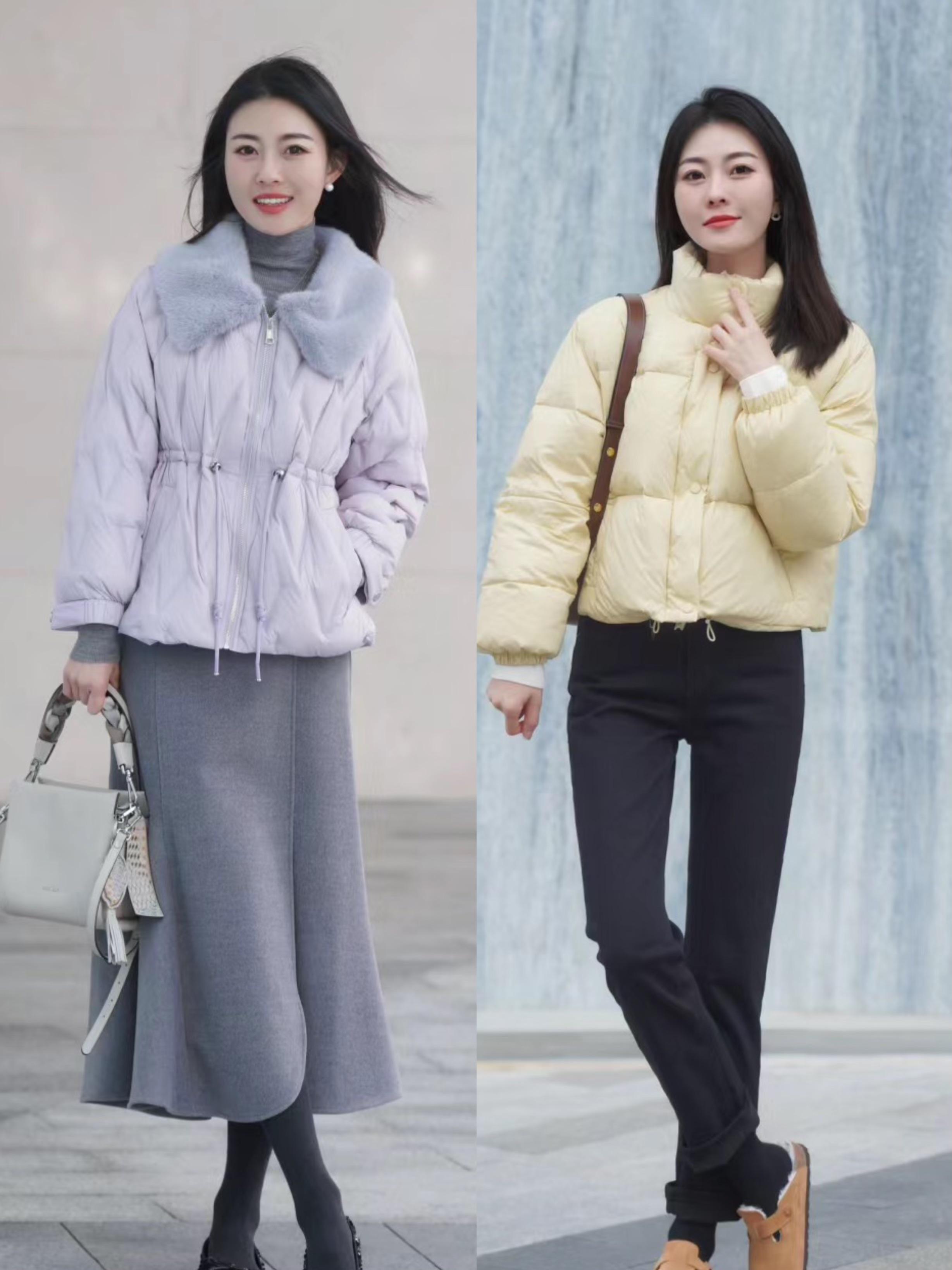 比如一件短款的羽絨服,我們可以搭配稍微俏皮甜美一點的娃娃領。小小的娃娃領裝飾,更多了幾分甜美感。娃娃領的短款羽絨服,也可以弱化年齡感,更顯年輕。
