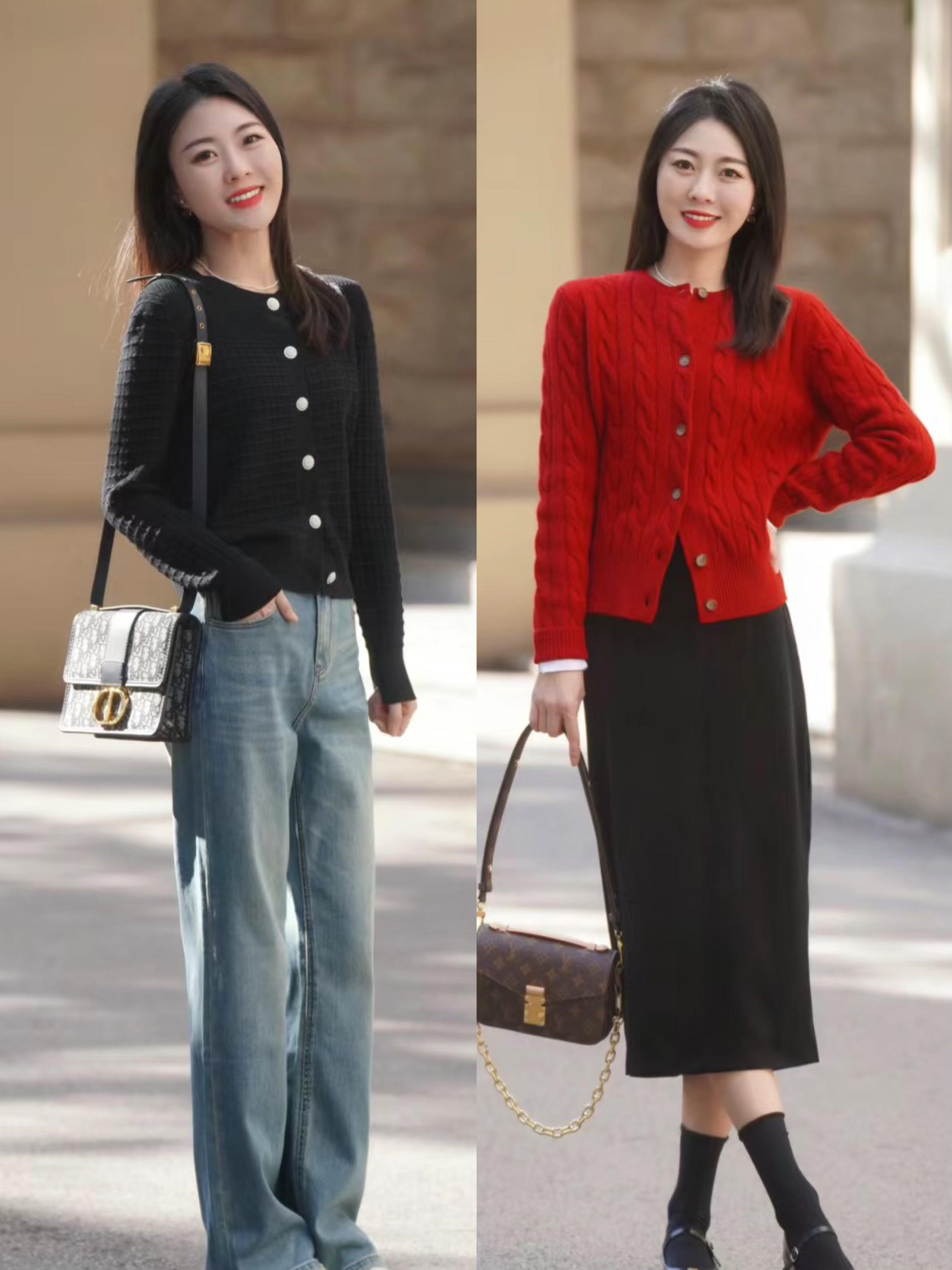 紅色系的絞花毛衣,有一種復古又顯白的效果。這種櫻桃紅的顏色比正紅色更容易駕馭,搭配了小小的紐扣裝飾,精緻又耐看,配黑色半身裙也很顯氣質。