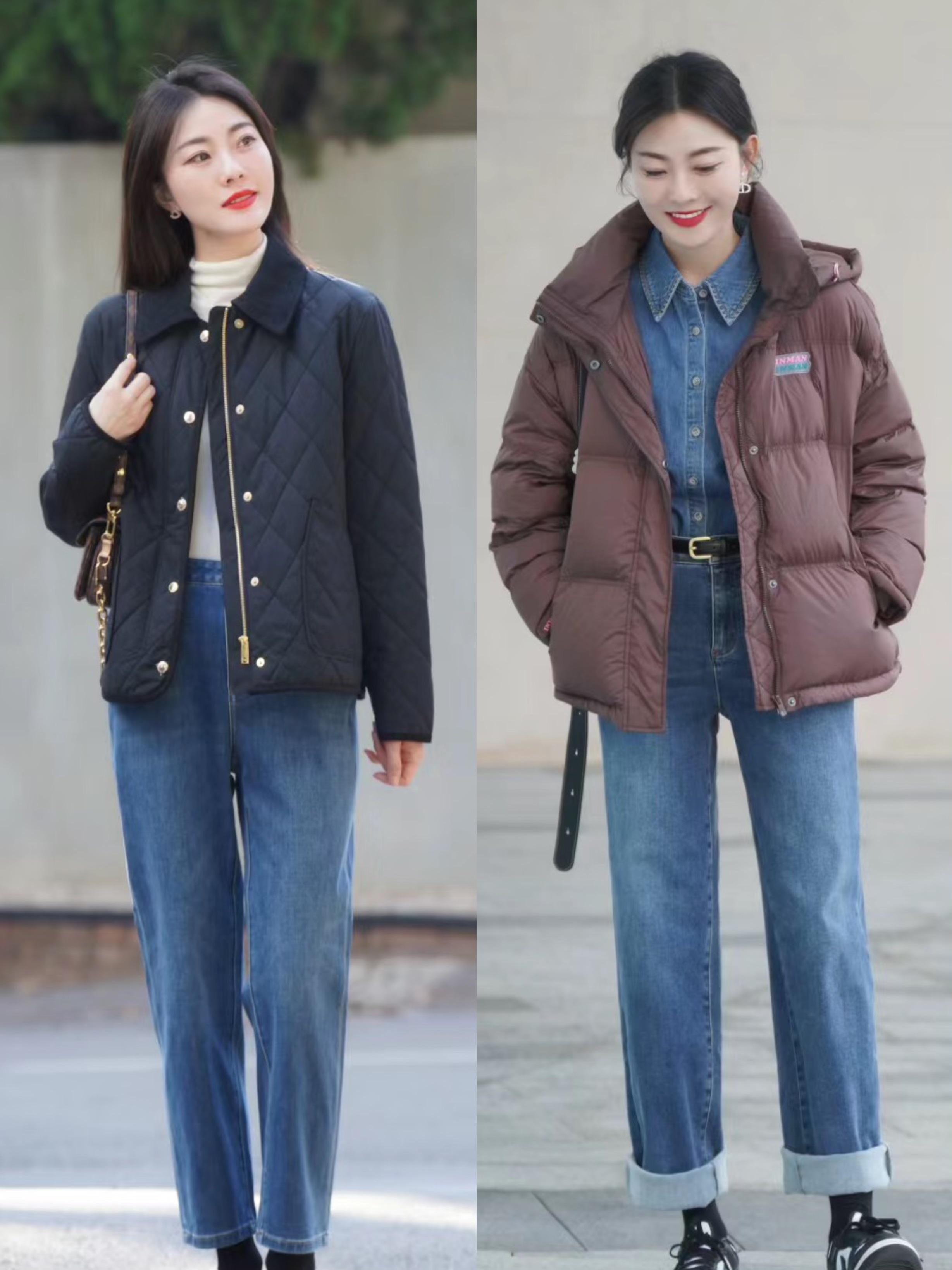 4、絎縫羽絨服+直筒牛仔褲