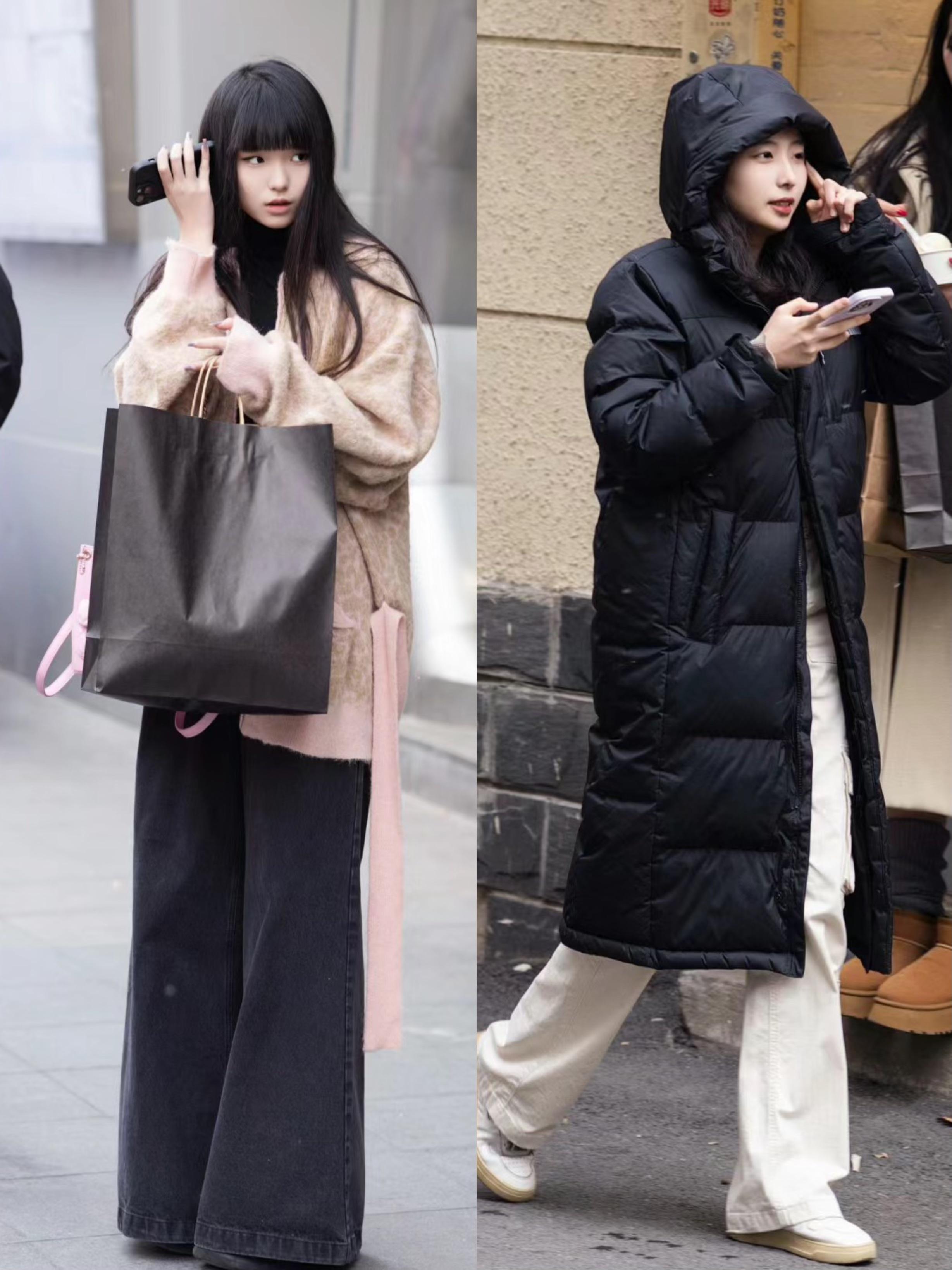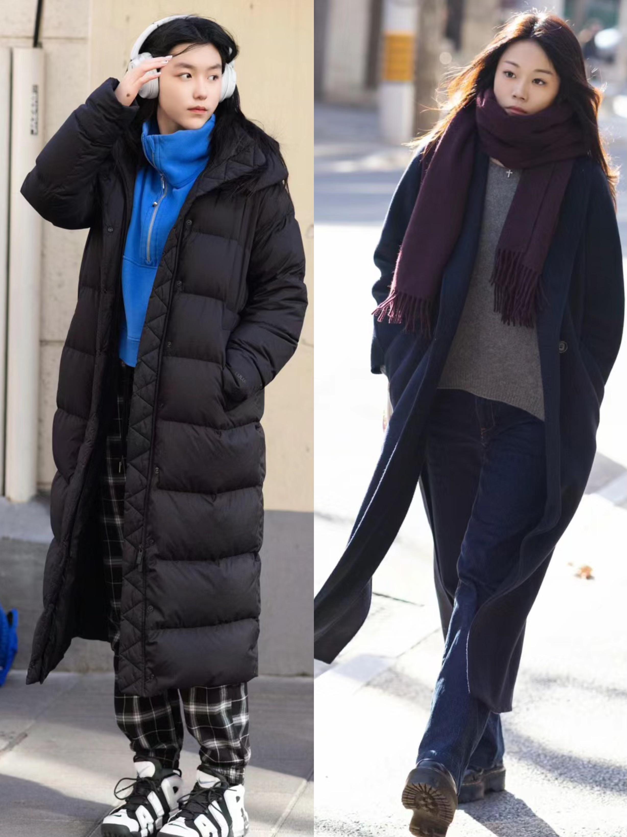 黑色系的長款羽絨服,或者寬鬆的外套,都可以搭配面料垂墜且比較硬挺的長褲來穿着。高腰的直筒褲,或者高腰的闊腿褲,穿起來都大方又有力量。