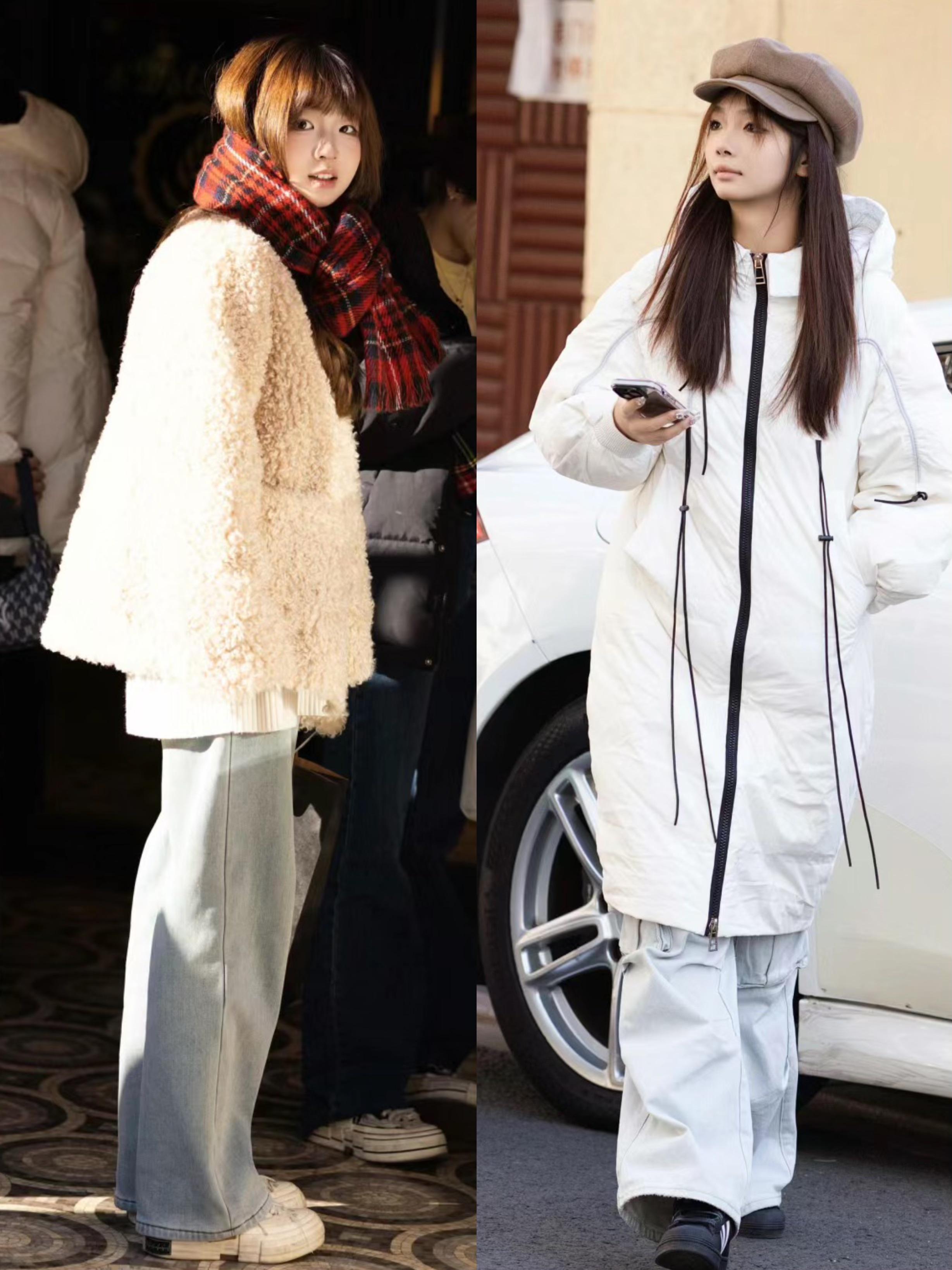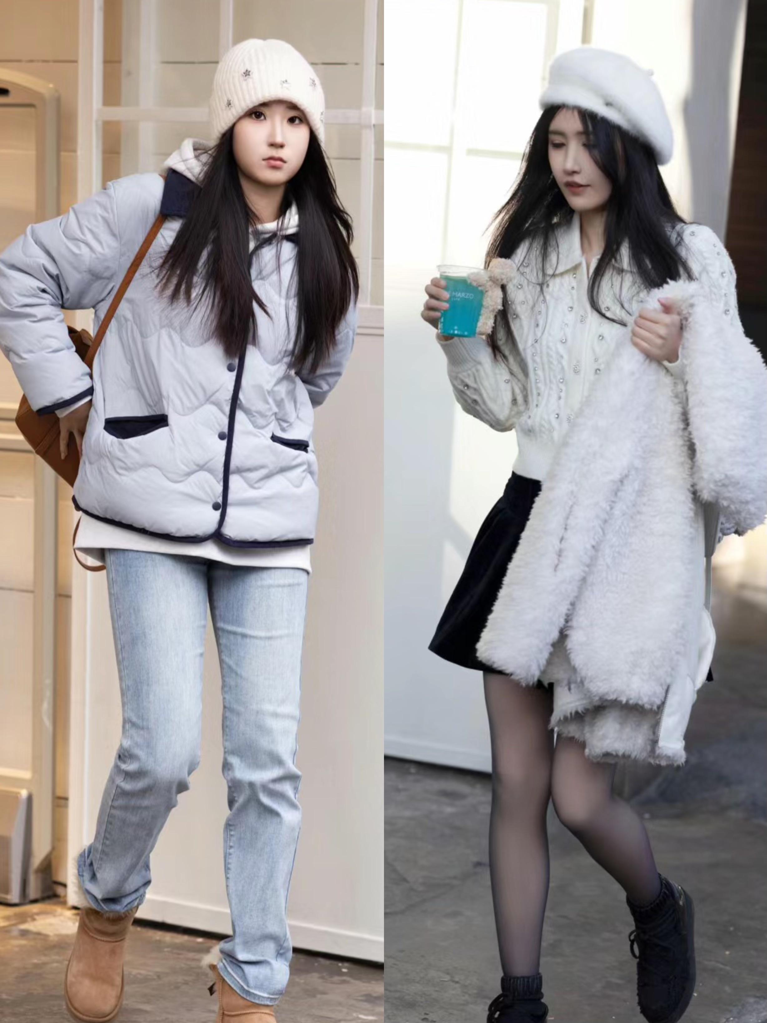 我們可以穿絎縫設計的短款羽絨服,來搭配淺藍色的牛仔褲。也可以穿白色系的針織衫、打底衫,來搭配白色羊羔絨外套。其實白色系的針織衫/打底衫,在冬天裏也很實用。