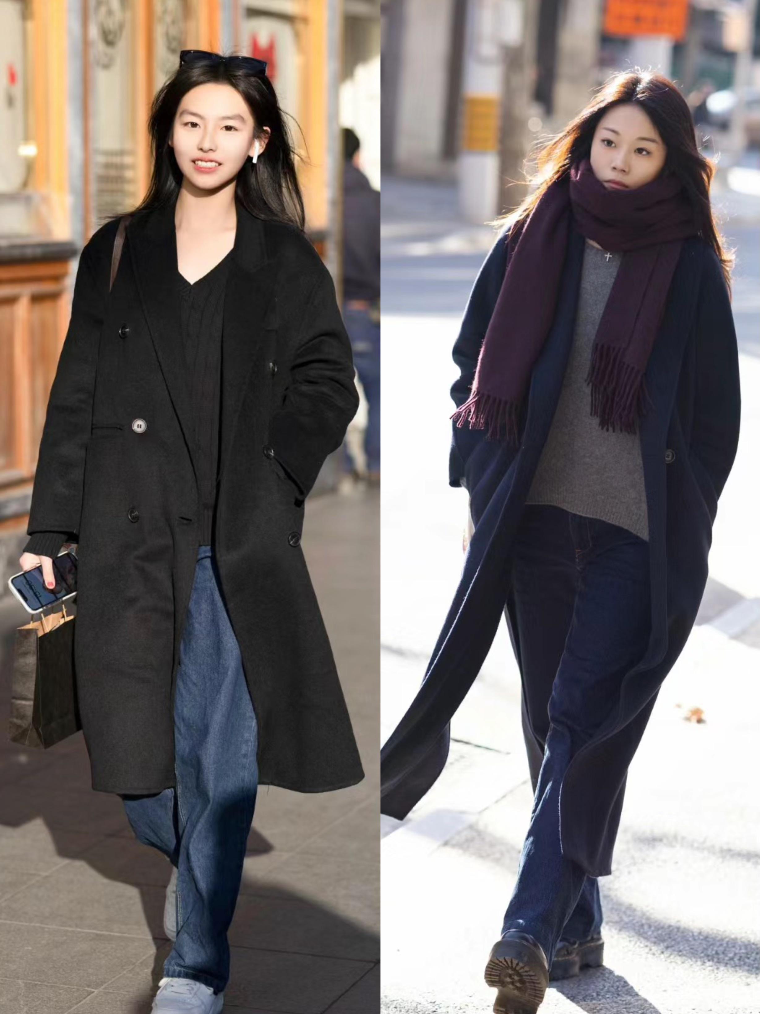 一件寬鬆的深色大衣,我們可以配灰色毛衣、深藍色牛仔褲,這種整體深色服裝的搭配,有一種低調又大氣的美。尤其是深藍色牛仔褲直筒的褲腿,可以顯得雙腿筆直修長。