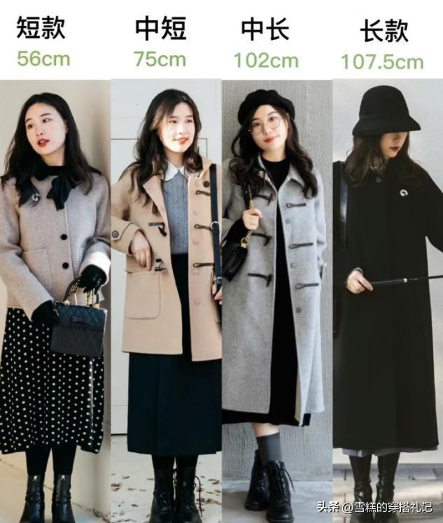 外套長度非常明顯的影響着你身材比例的展現,不知道有多少女生髮現了這個現象。小個子女生如果個子不超過160,那麼穿長款外套就很容易壓個頭,以比較常見的不同長度的外套爲例,來爲大家做好細節的劃分。