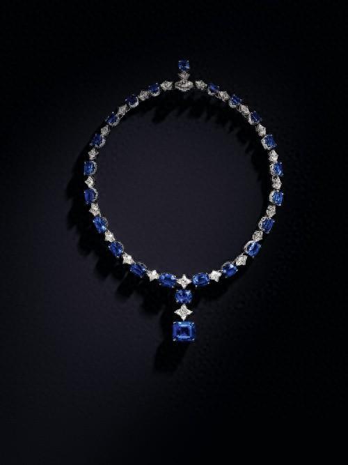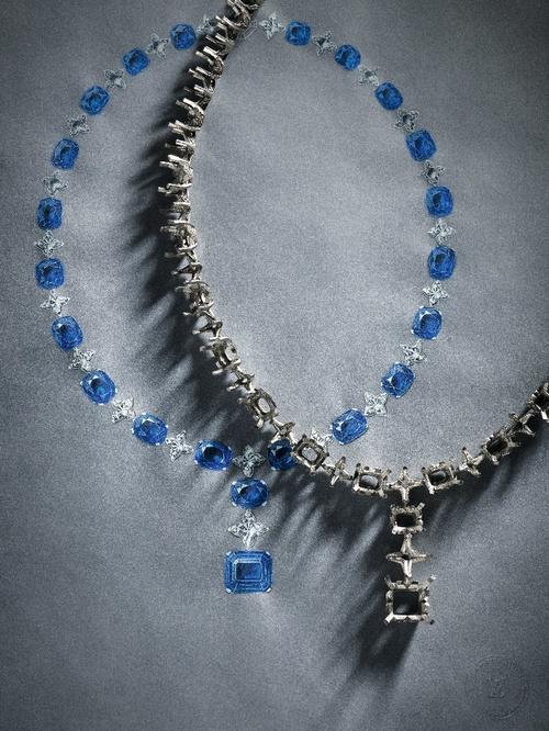 路易威登Aster高級珠寶項鍊造型醒目而優雅,由23顆極爲稀有的高品質克什米爾藍寶石組成。這些藍寶石總重達125克拉,大小從2.80克拉到17.88克拉(主鑽)不等,透現出澄澈而深邃的皇家藍色調,令人憶起日暮時分的柔和天空,且在色澤、形狀和淨度方面都完美匹配。藍寶石產自印度北部的克什米爾地區,耗費近20年時間纔開採完成。克什米爾地區山巒起伏,頗具神祕色彩,蘊藏着印度大君和大亨的悠久歷史。