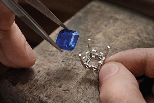首先,珠寶工匠採用失蠟鑄造工藝(cire perdue),用鉑金鍛造出項鍊上的每個獨立元素。接着,拋光工匠將每個元素打磨成精細顆粒狀。僅一個鑲嵌座的拋光就耗時一小時。最後,工坊內最爲資深的珠寶鑲嵌工匠將23顆珍貴藍寶石、與之相配的LV Monogram星形切割鑽石和大量密鑲寶石悉數鑲嵌到位。這道工序也極其考驗工匠的細心程度,僅一顆藍寶石的鑲嵌工時便長達兩天。