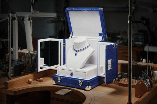 正如路易威登高級珠寶系列的其他作品一樣,路易威登Aster高級珠寶項鍊也配有相應的定製珠寶箱。這款特別設計的珠寶箱誕生於路易威登歷史悠久的Asnières工坊,擁有雙面開啓設計,這種獎盃箱式的罕見開啓方式只爲呈現路易威登最爲卓爾不凡的作品。珠寶箱內部採用阿爾坎塔拉內襯飾板,飾板上巧妙鑲嵌鏡子,令觀者能夠從各個角度欣賞項鍊。同時,珠寶箱外部覆有特殊的皇家藍皮革,巧妙呼應項鍊的皇家藍克什米爾藍寶石色調,與璀璨動人的項鍊相輔相成。