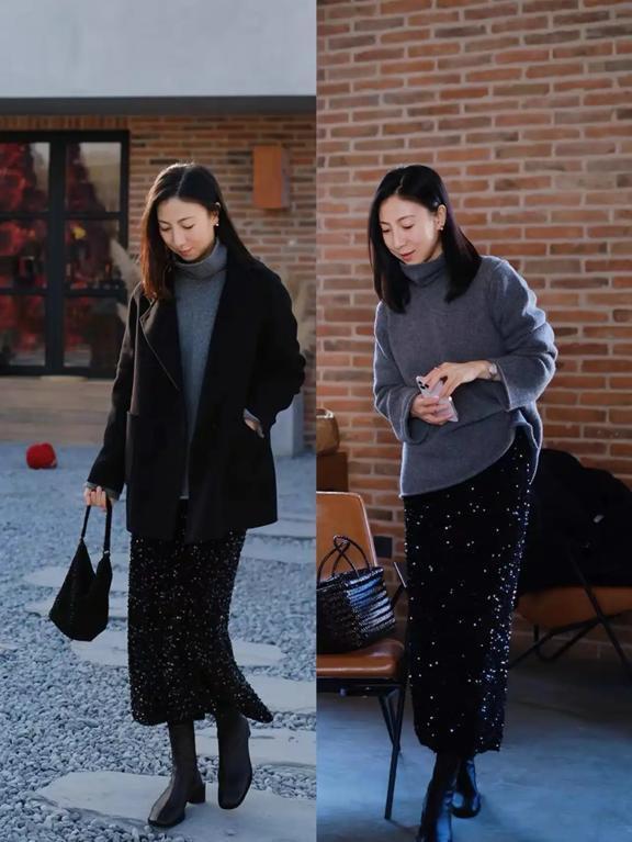 像這種直筒的亮片半身裙,我們可以搭配基礎款的毛衣穿着。直筒的亮片半身裙,擁有一定的修身效果,可以勾勒出腰臀部優越的曲線,更多了優雅的女性魅力。
