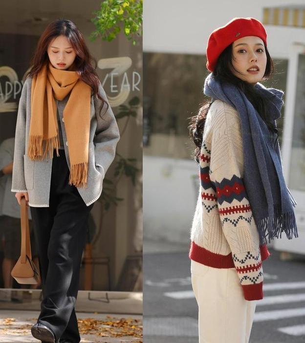不管是我們穿復古風的毛衣、還是穿灰色系的毛絨外套,都可以搭配羊絨圍巾來穿着。一條細膩軟糯的羊絨圍巾,可以給人一種溫柔又細膩的美。厚實的羊絨圍巾,純色系的款式也很耐看。