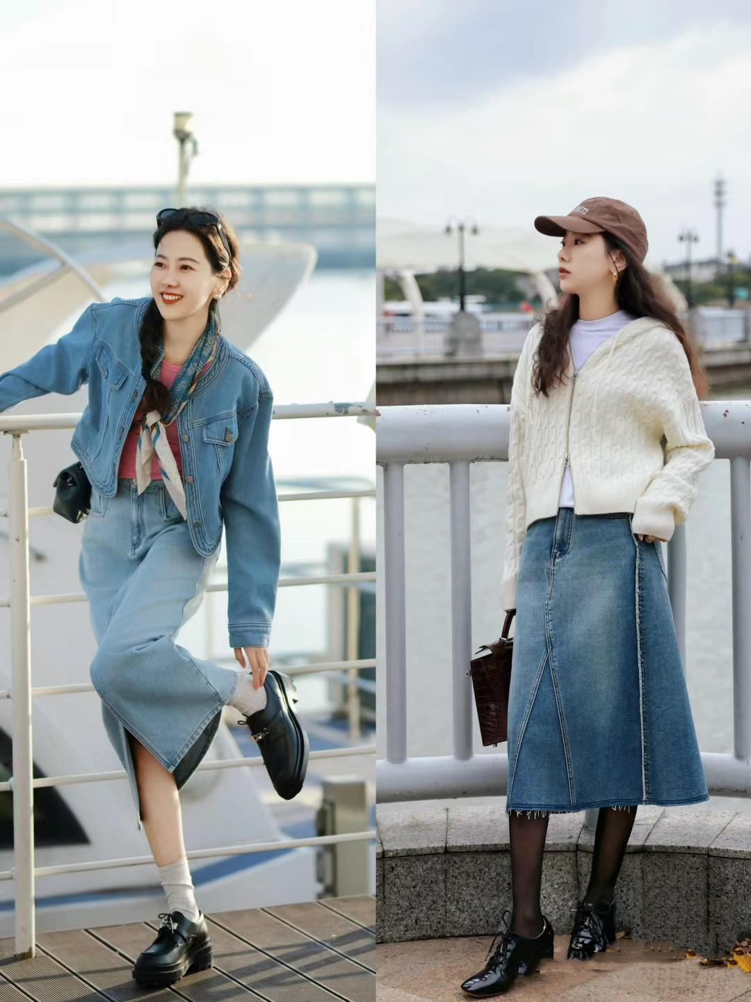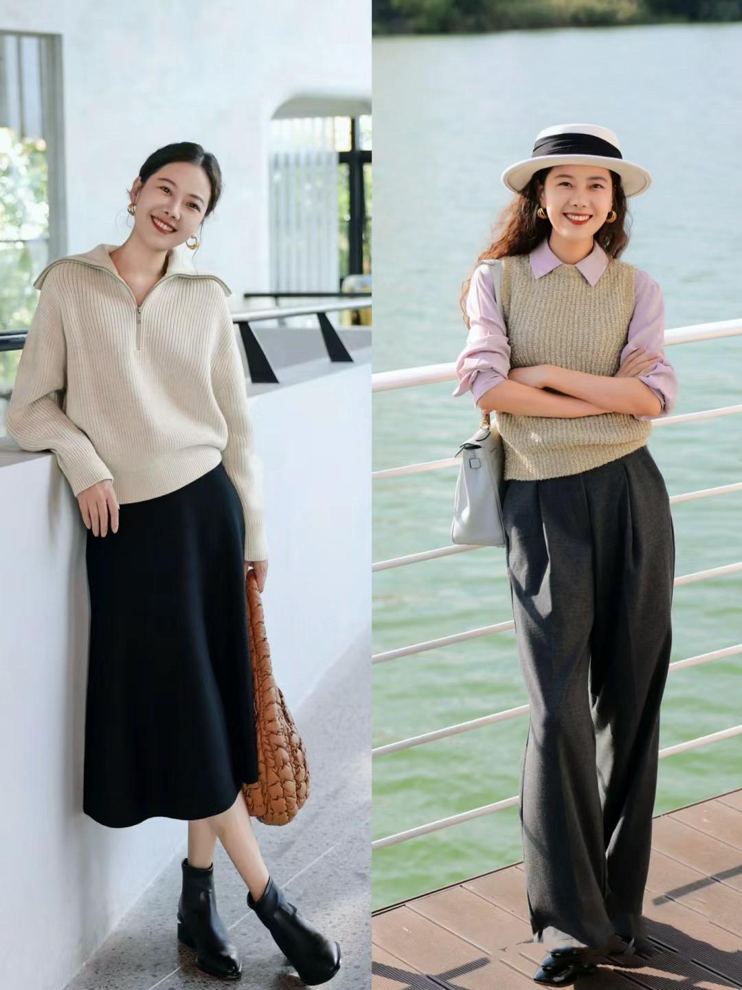 我們用半拉鍊的毛衣來搭配高腰的黑色半身裙,溫柔又有力量。黑色半身裙可以選擇比較垂順的裙襬,塑造出簡約大氣的美。